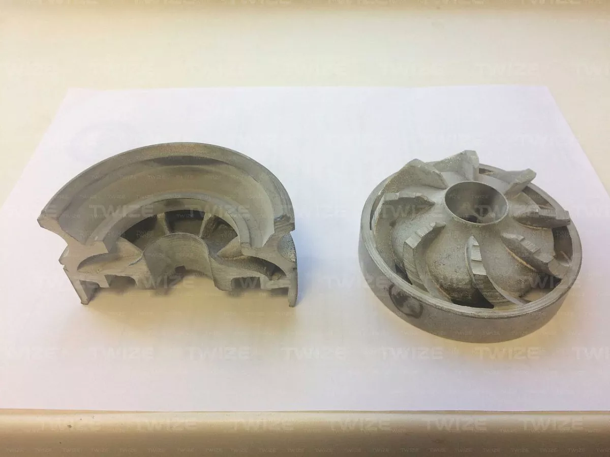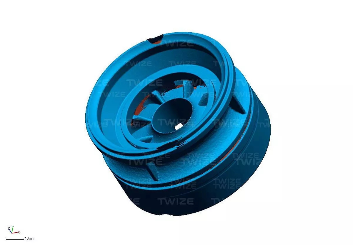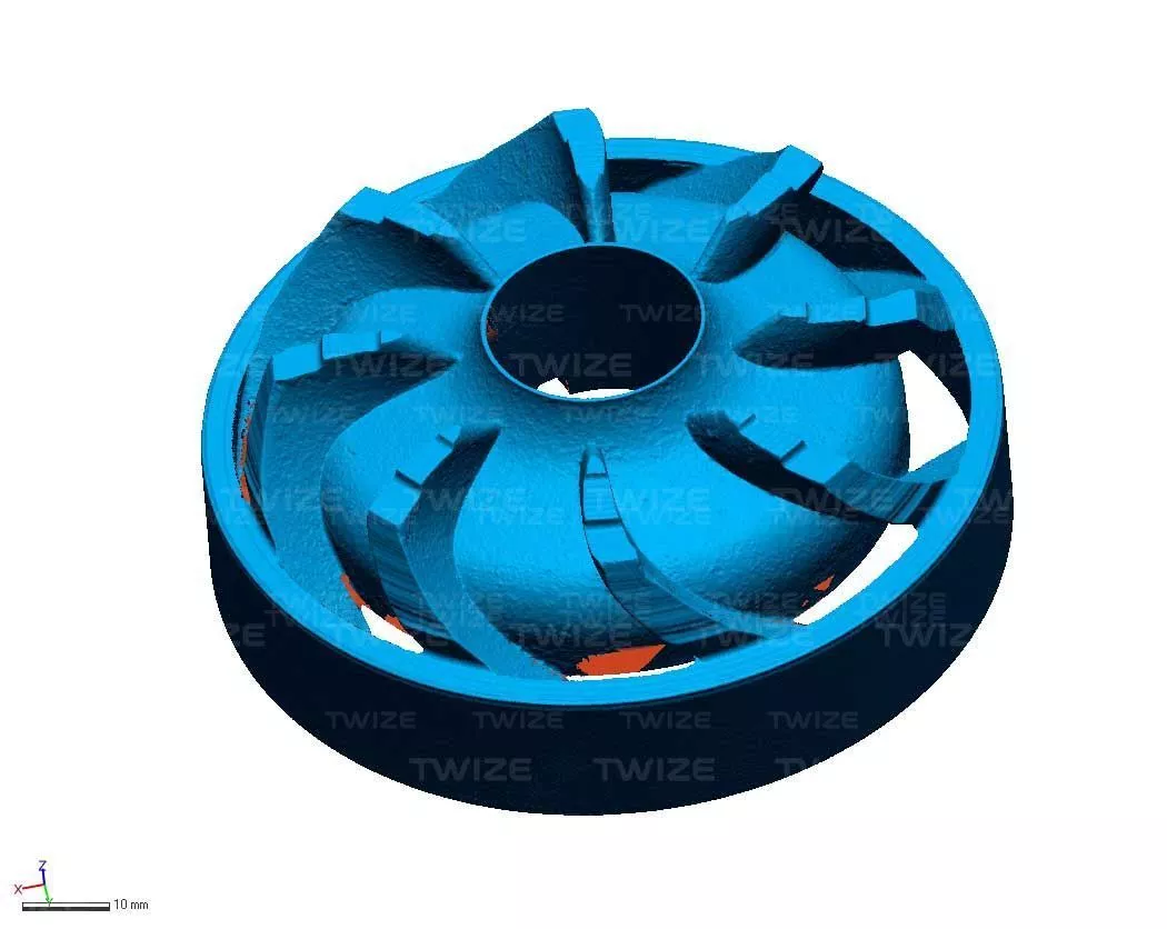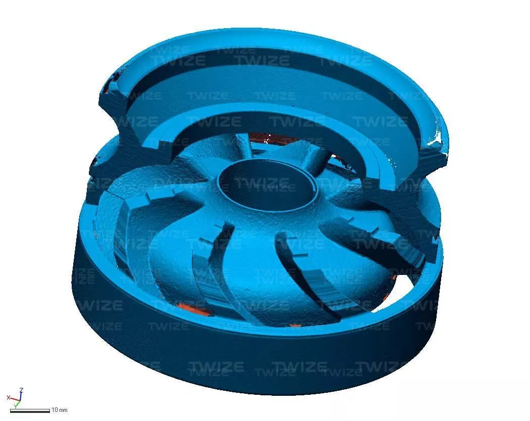 Проведено 3D‑сканирование изделия с повторным 3D‑сканированием поперечного разреза этого же изделия для получения профиля детали и с дополнительным 3D‑сканированием аналогичной детали с оголенными лопатками для фиксирования формы лопаток. Создана CAD‑модель изделия для производства и произведены детали путем металлического литья с последующей мехобработкой.