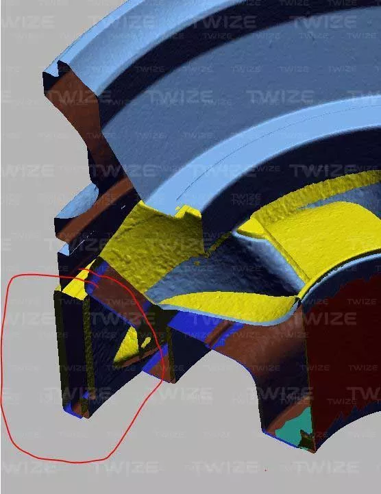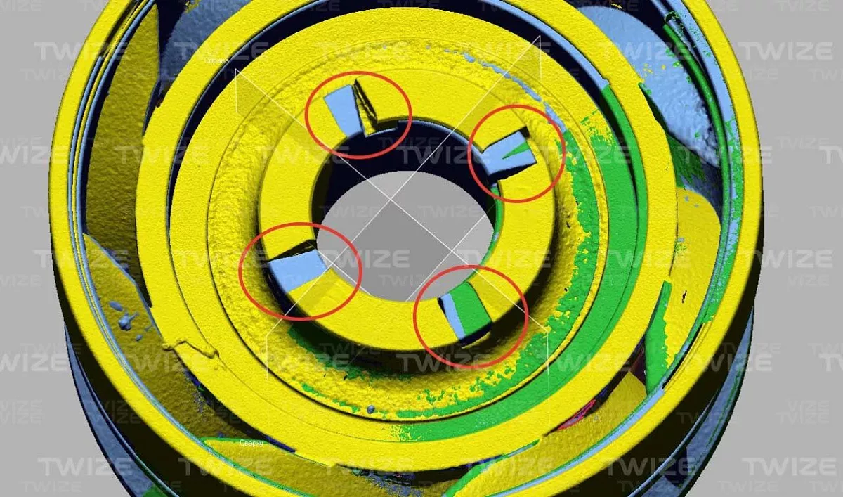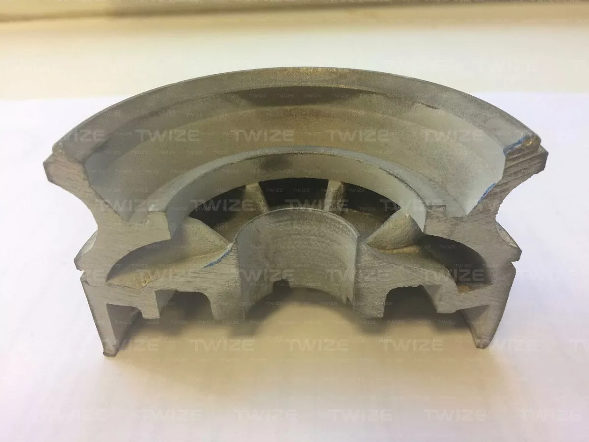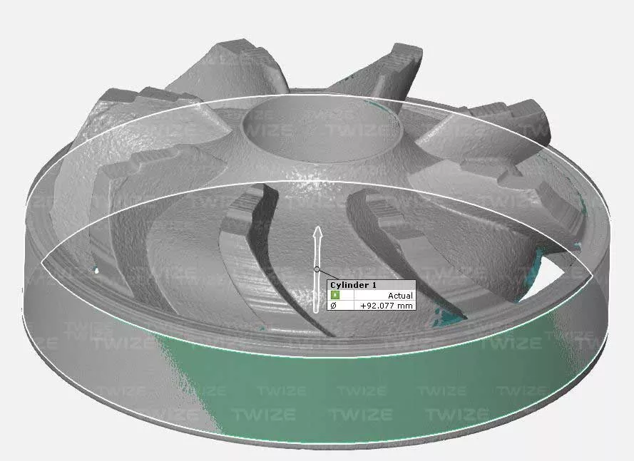 Проведено 3D‑сканирование изделия с повторным 3D‑сканированием поперечного разреза этого же изделия для получения профиля детали и с дополнительным 3D‑сканированием аналогичной детали с оголенными лопатками для фиксирования формы лопаток. Создана CAD‑модель изделия для производства и произведены детали путем металлического литья с последующей мехобработкой.