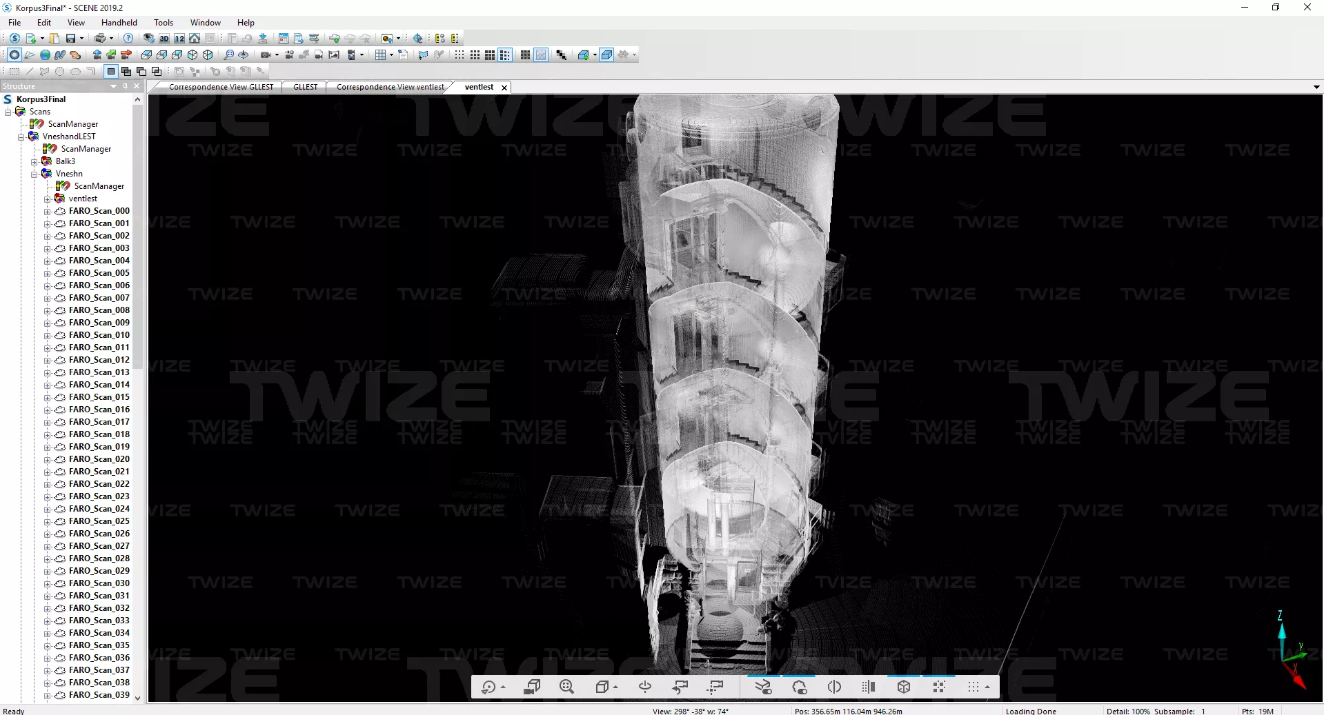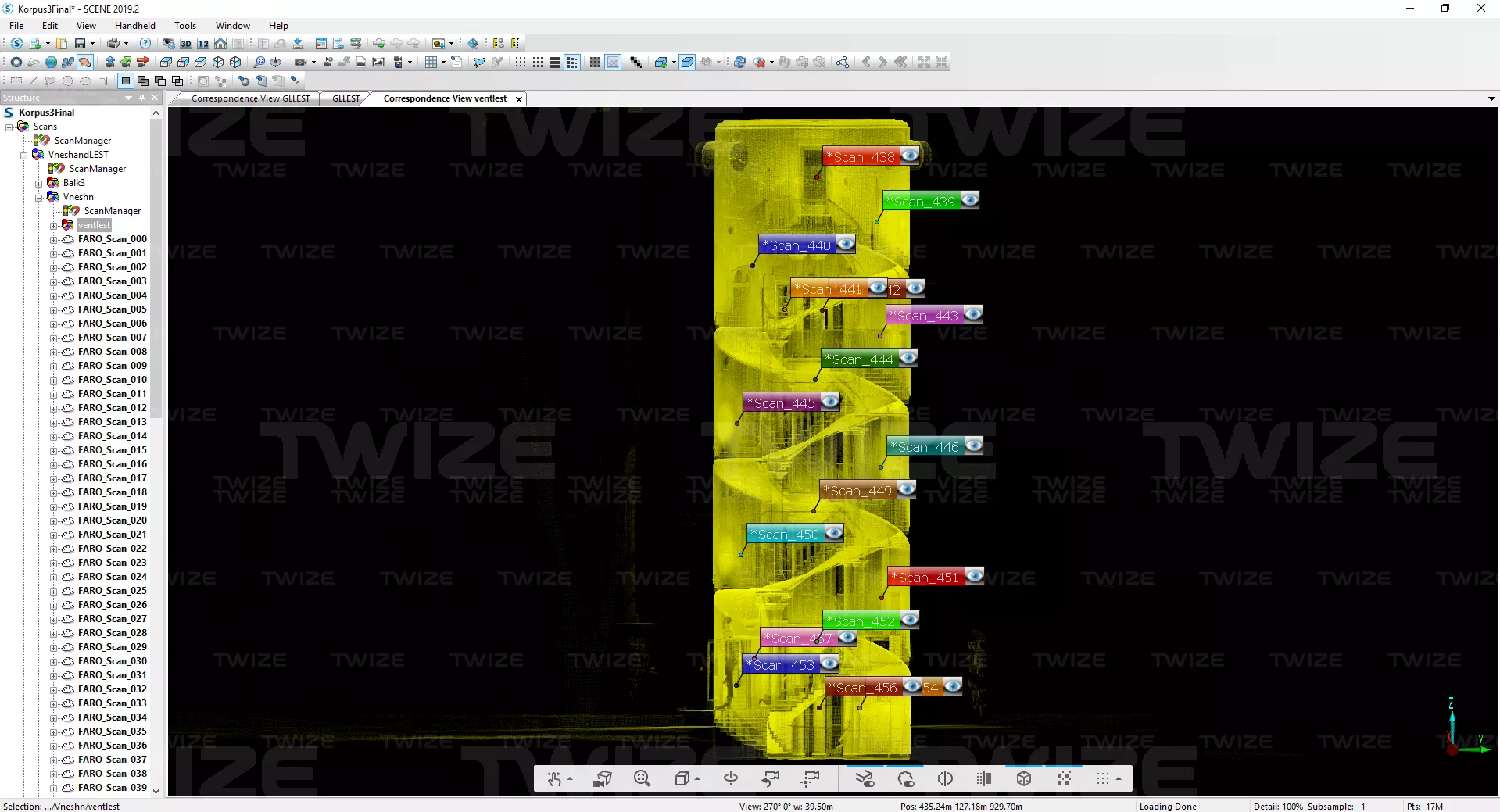 облако точек лестниц с установками 3D‑сканера размещенными в единой системе координат