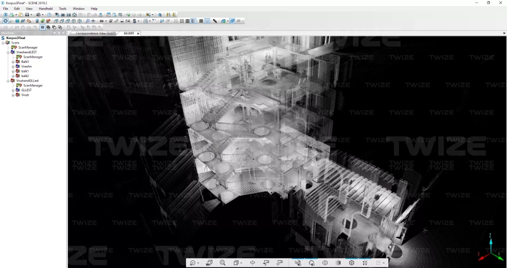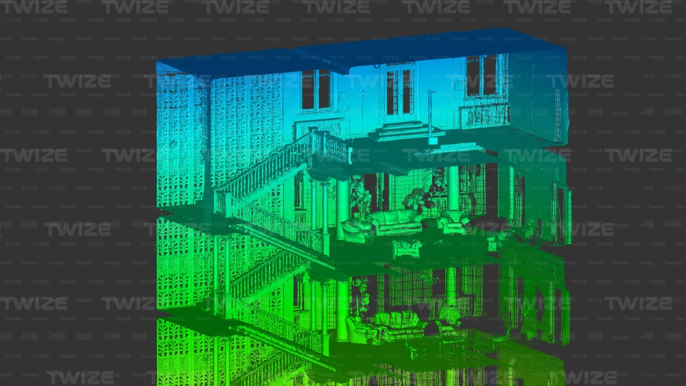 Проведено 3D‑сканирование главной и винтовой лестницы доходного дома. По результатам сканирования сформировано облако точек винтовой и главной лестниц здания.