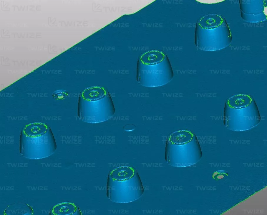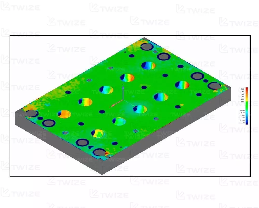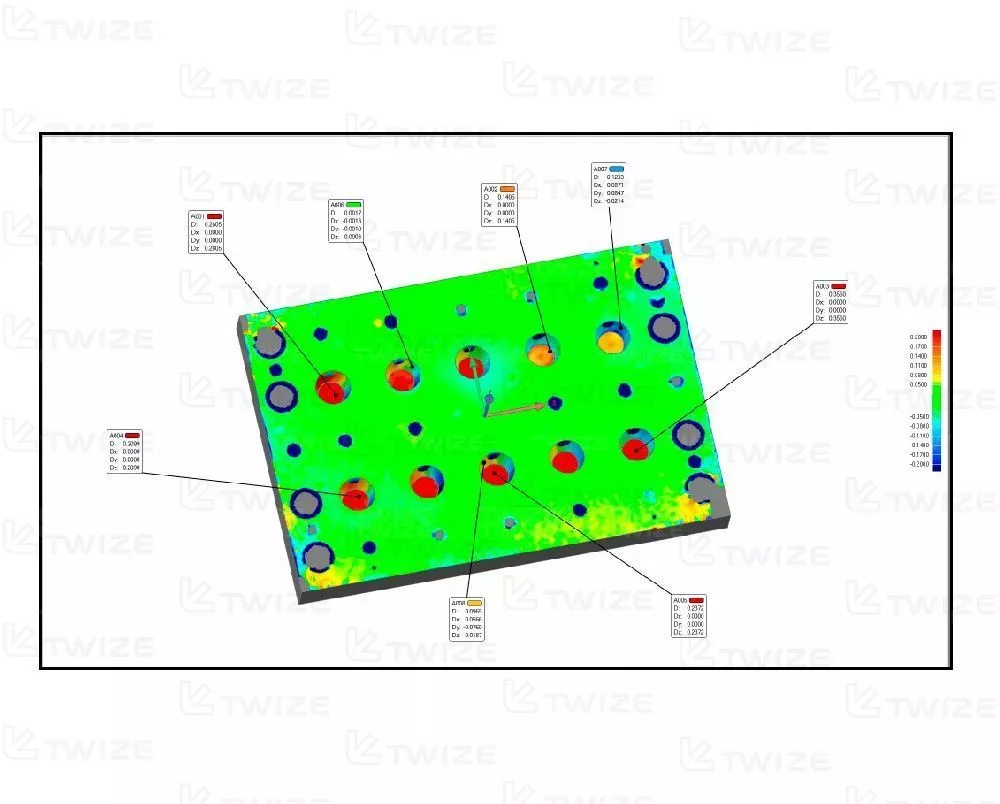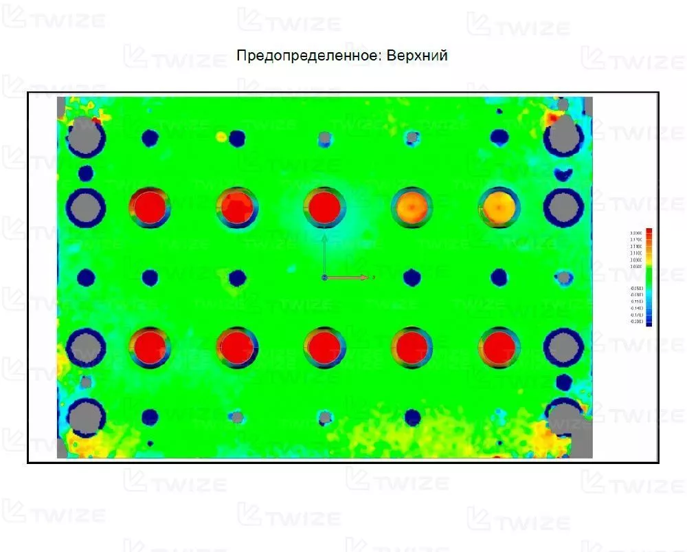 отчет контроля отклонений геометрии пресс‑форм. Выявление зон, выходящих за пределы допусков в виде цветовой диаграммы с контрольными точками по всей поверхности пресс‑форм с демонстрацией отклонений в абсолютных величинах.