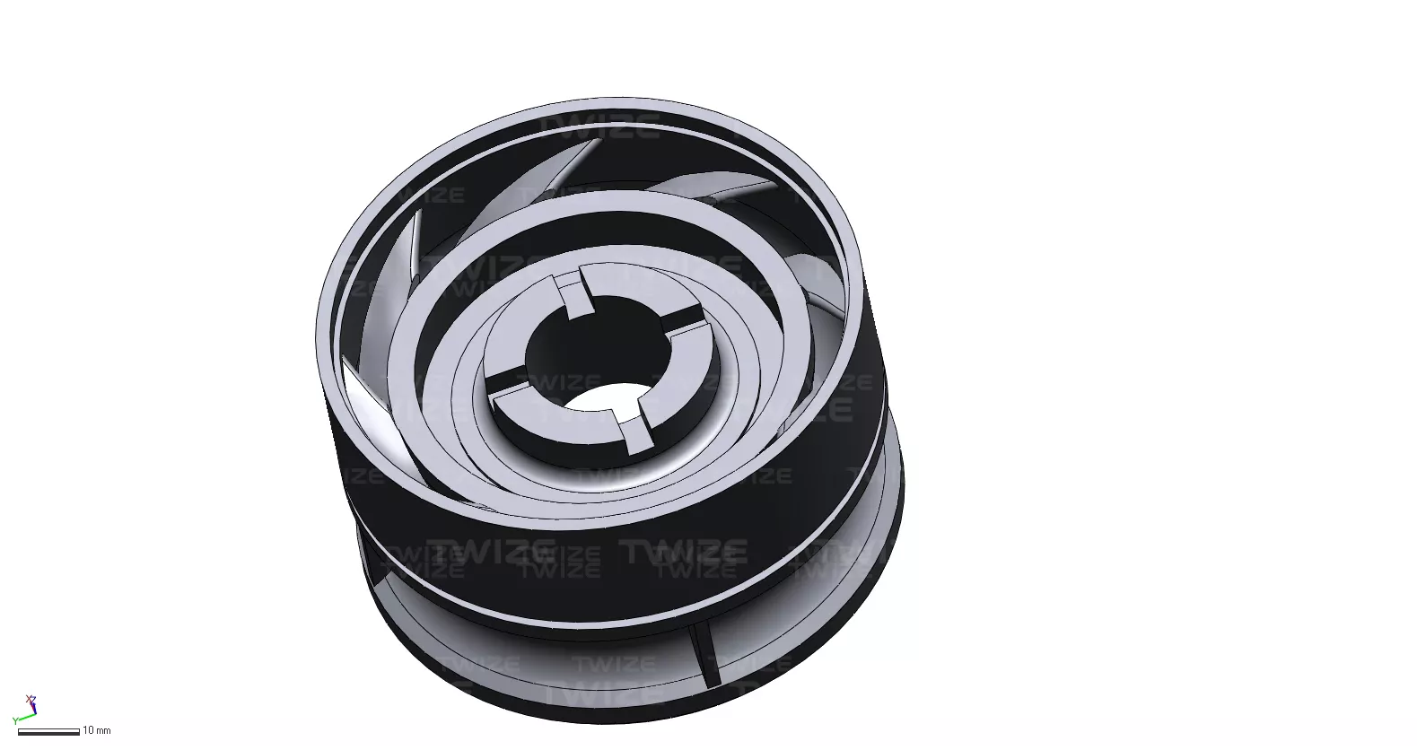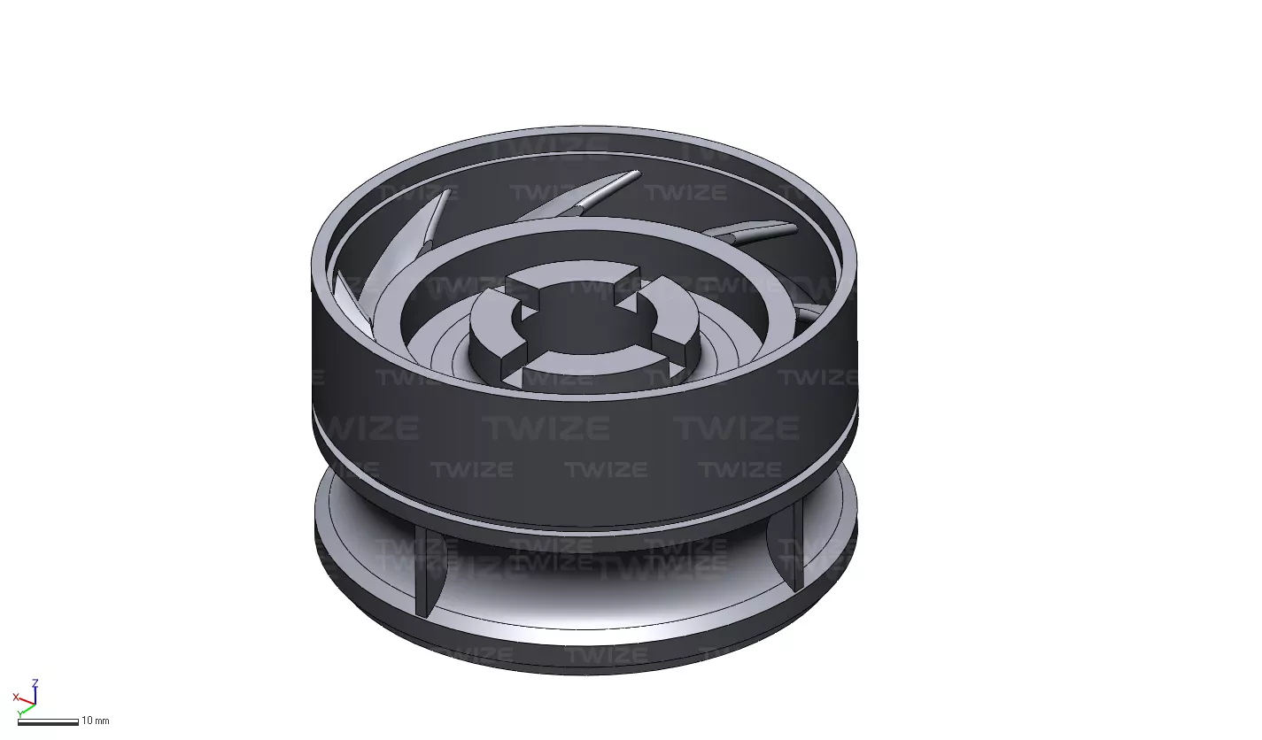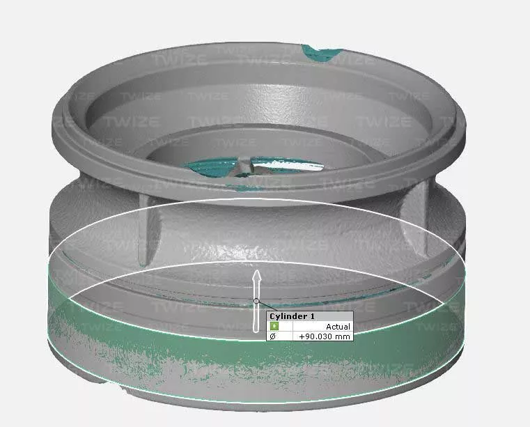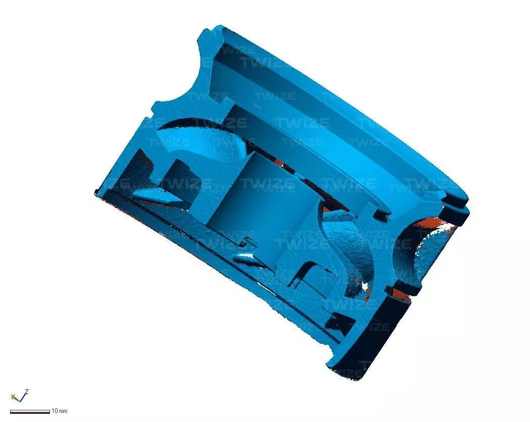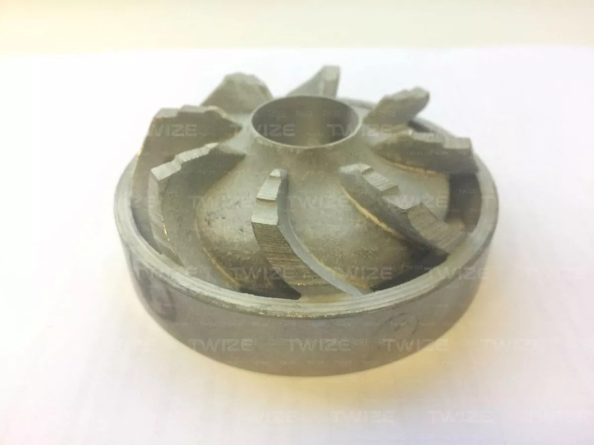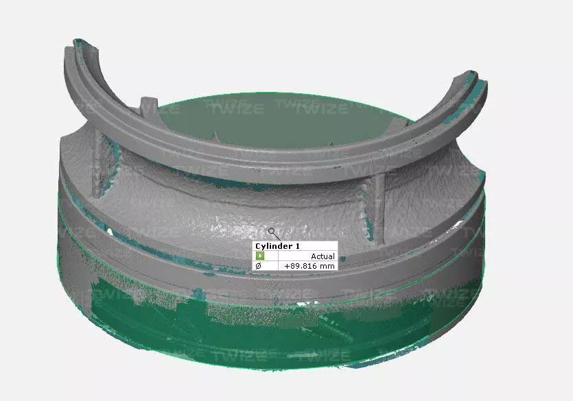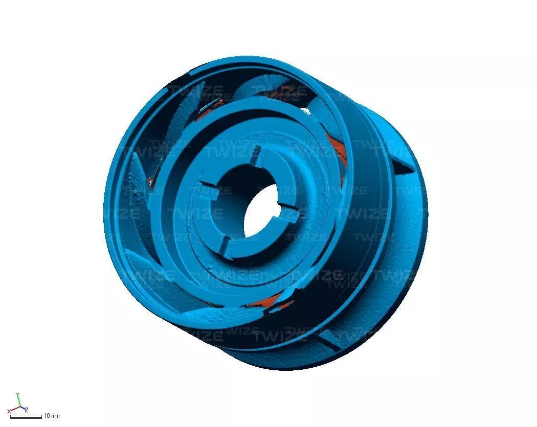 Проведено 3D‑сканирование изделия с повторным 3D‑сканированием поперечного разреза этого же изделия для получения профиля детали и с дополнительным 3D‑сканированием аналогичной детали с оголенными лопатками для фиксирования формы лопаток. Создана CAD‑модель изделия для производства и произведены детали путем металлического литья с последующей мехобработкой.