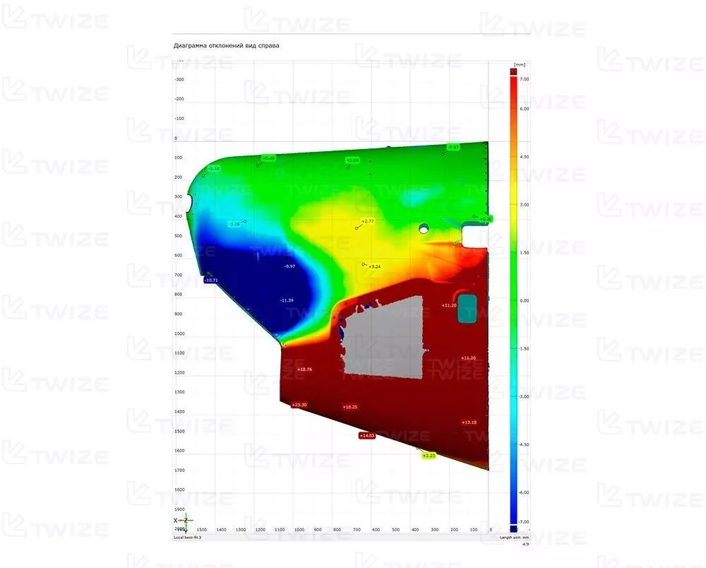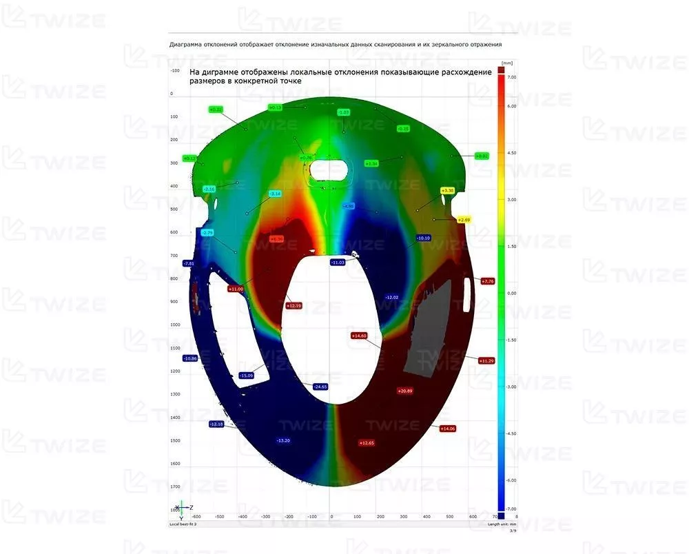 Отчет контроля симметричности отклонений законцовки хвостового оперения самолета в виде цветовой диаграммы с контрольными точками по всей поверхности детали с демонстрацией отклонений в абсолютных величинах