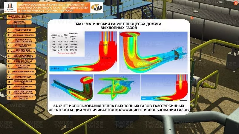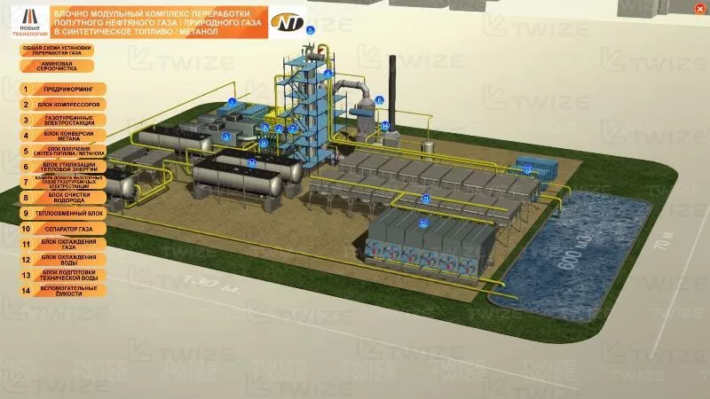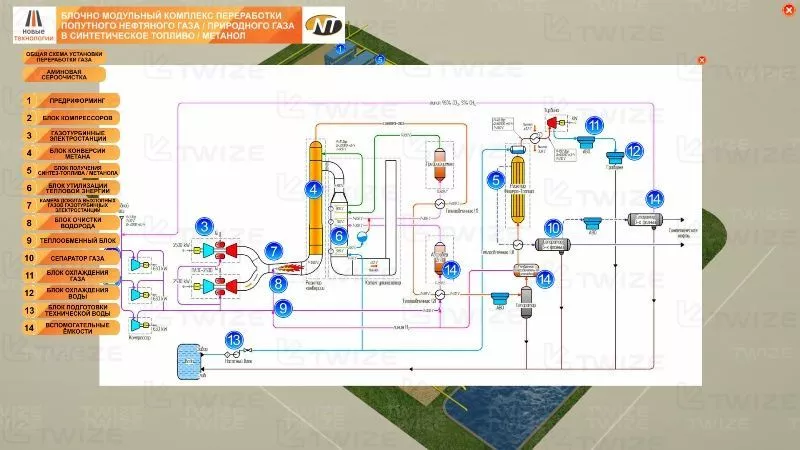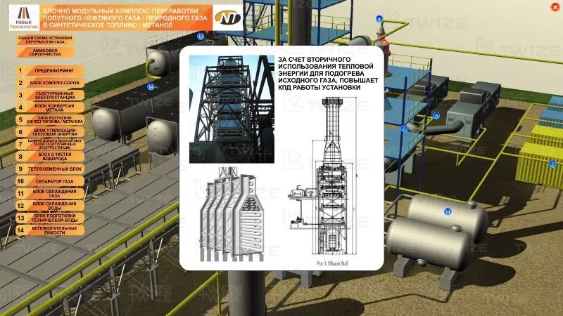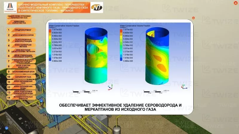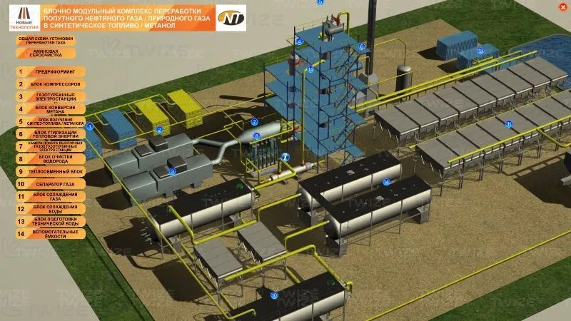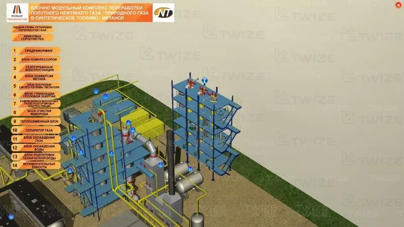 Создать точную 3D-модель газоперерабатывающего завода с отображением схемы и плана завода, с демонстрацией последовательности работы предприятия и с характеристиками узлов.