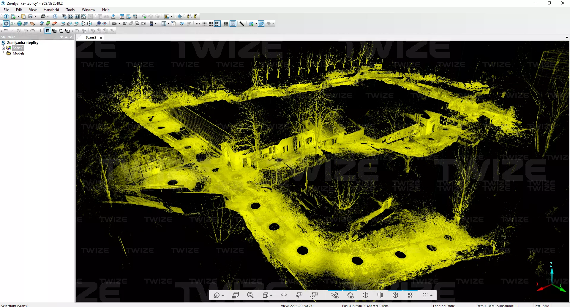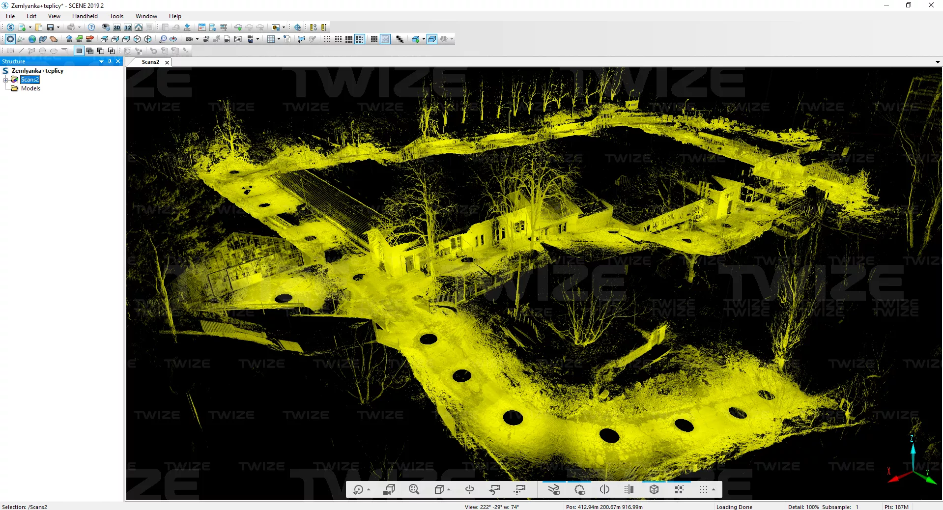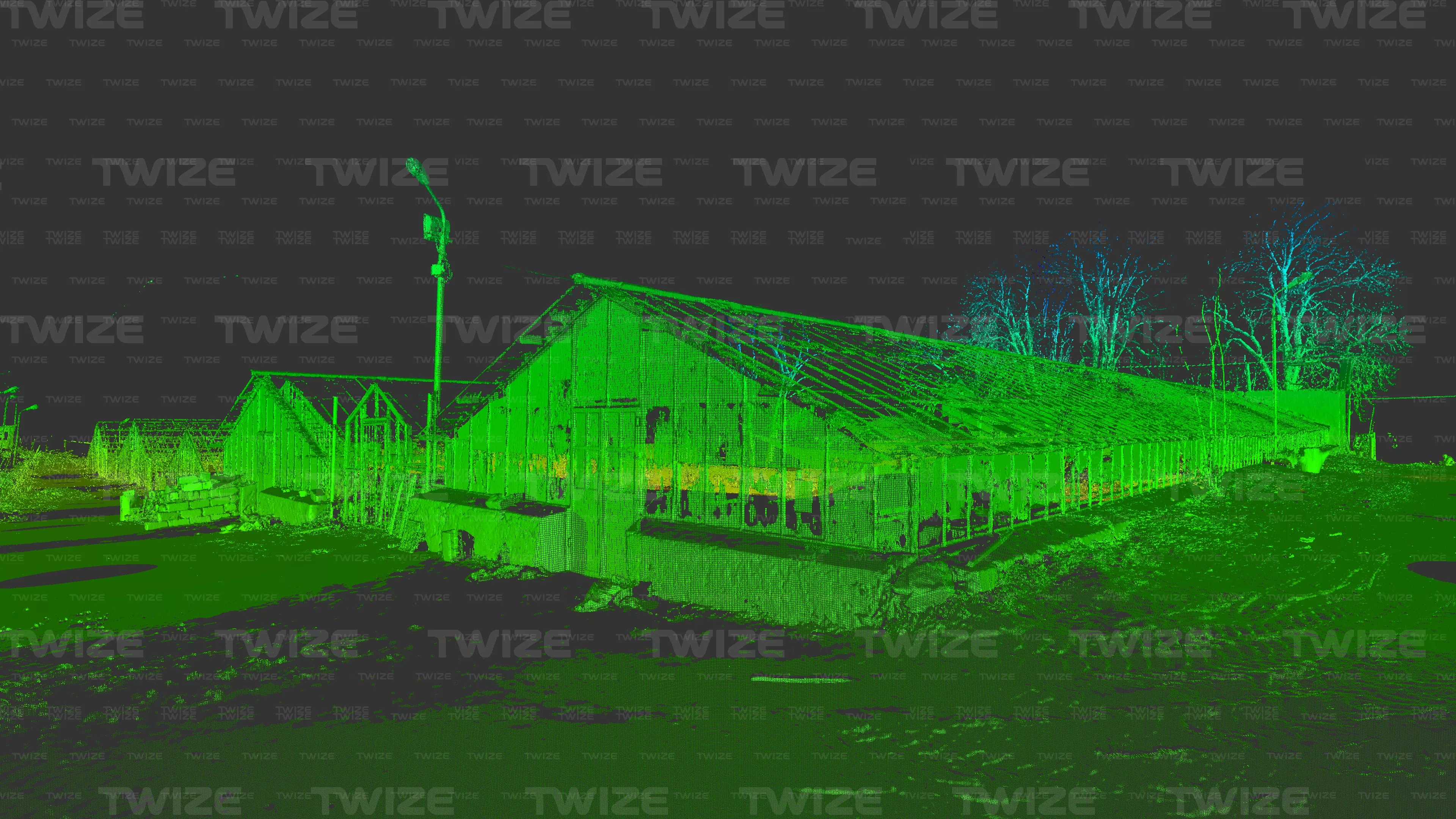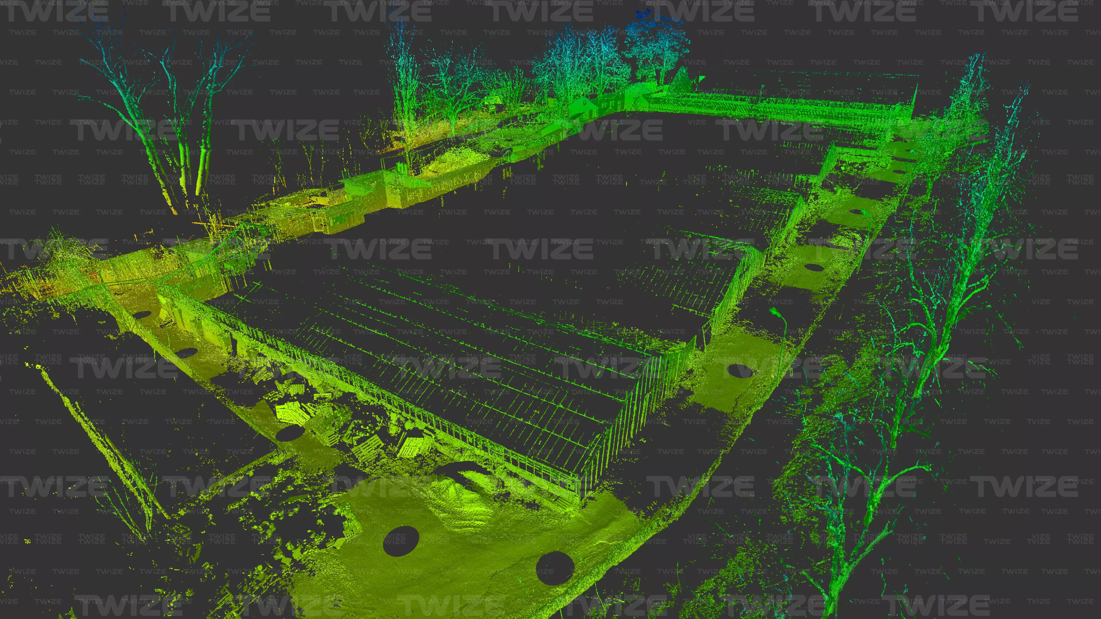 Проведено 3D‑сканирование тепличного комплекса. По результатам сканирования сформировано облако точек комплекса.