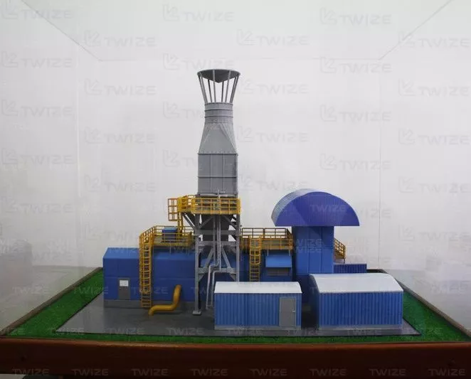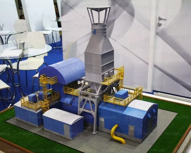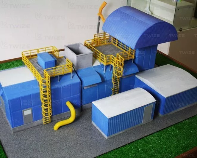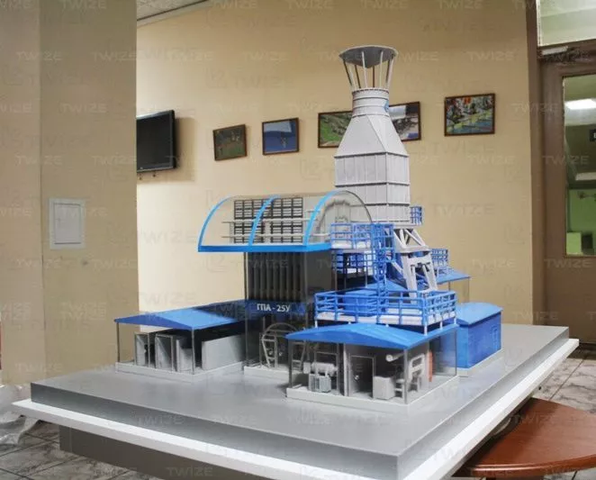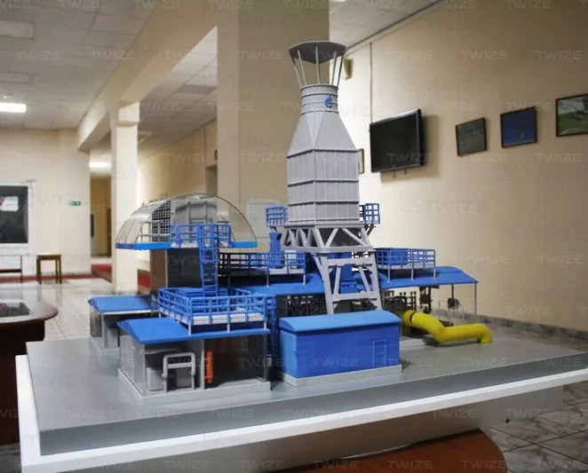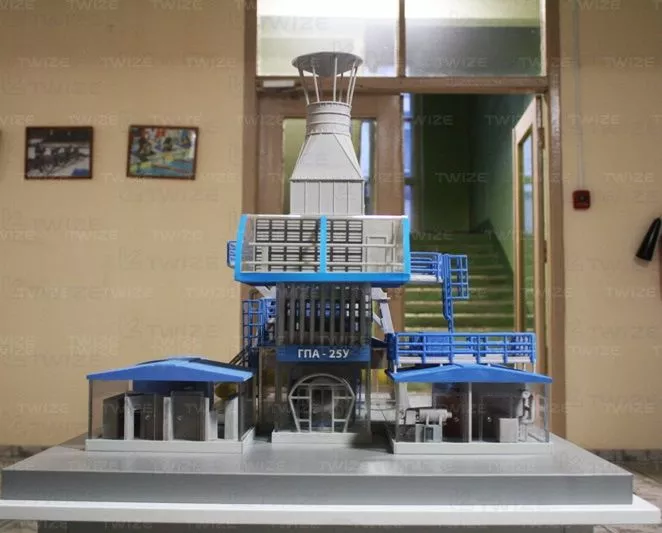 Макет с внутренним наполнением комплекса реализован с помощью прозрачных стен сооружения. На основании полученных чертежей разработаны 3D‑модели соответствующего газоперекачивающего агрегата. Подготовлены 3D‑модели к изготовлению. Проведена 3D‑печать корпуса и агрегата. Отдельные части собраны в макет. Срок выполнения всего проекта – 1 месяц.