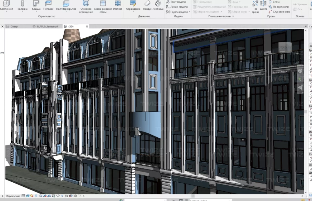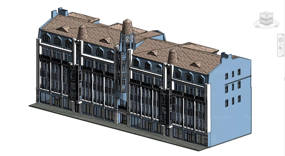BIM-модель, включающая в себя фасады и кровлю здания. Уровень детализации модели – LOD 300