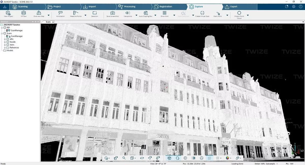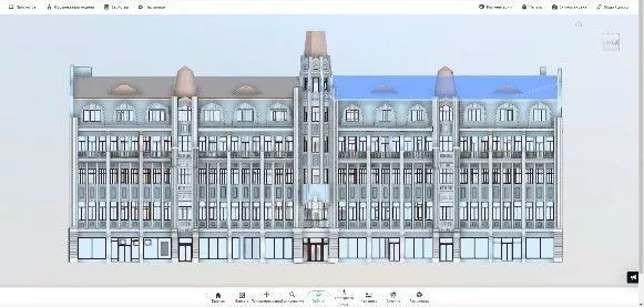 Методом наземного лазерного сканирования выполнить обмеры фасадов и кровли исторического здания гостиницы «Волга» («Астория») в г. Саратове (возведена в 1917 г. по проекту архитектора С.А. Калистратова), сформировать 3D‑модель здания.