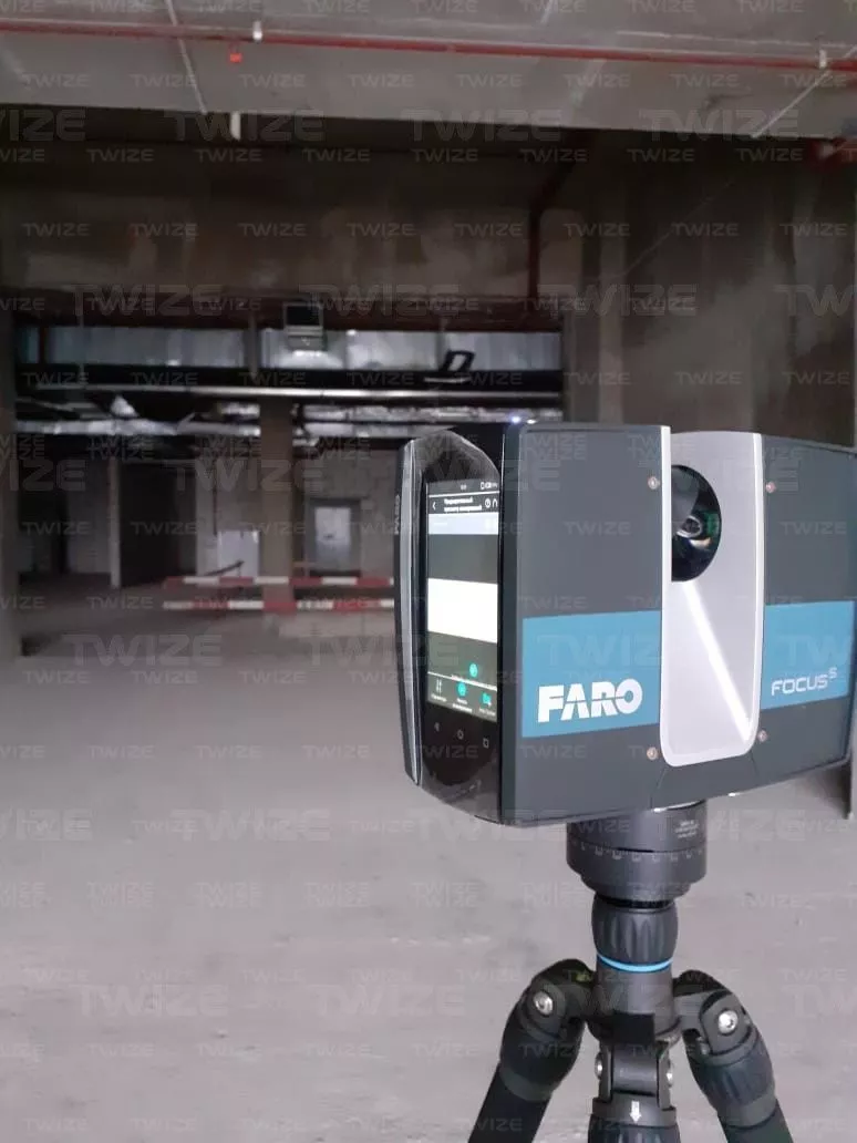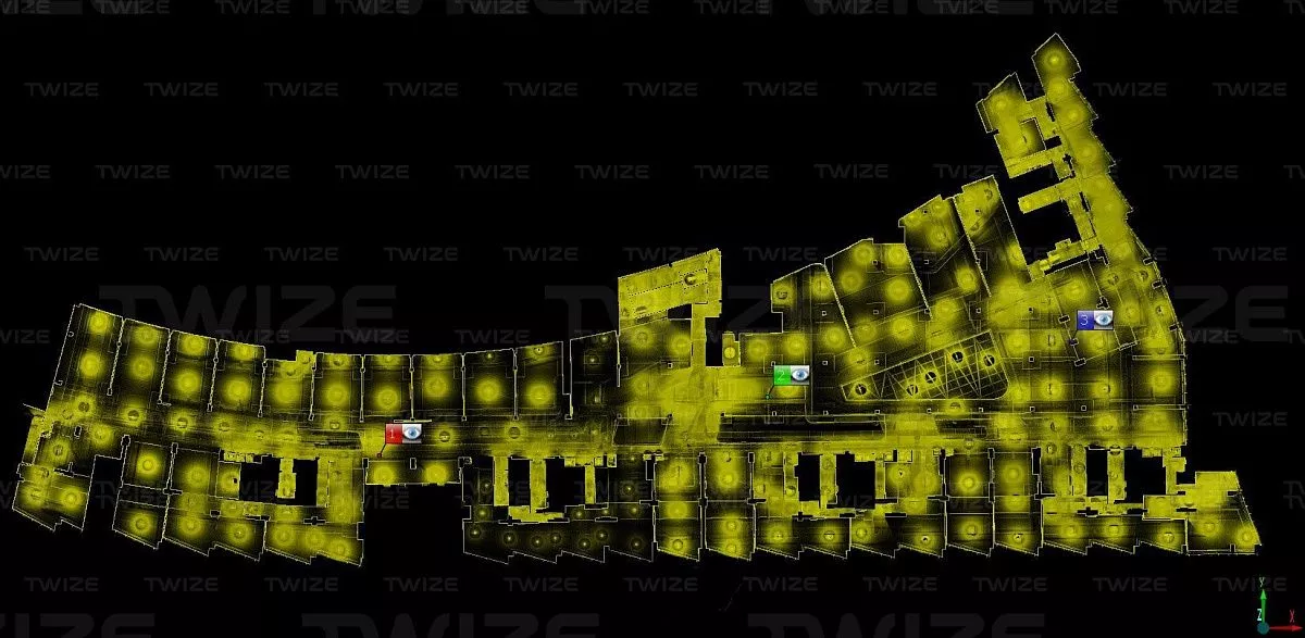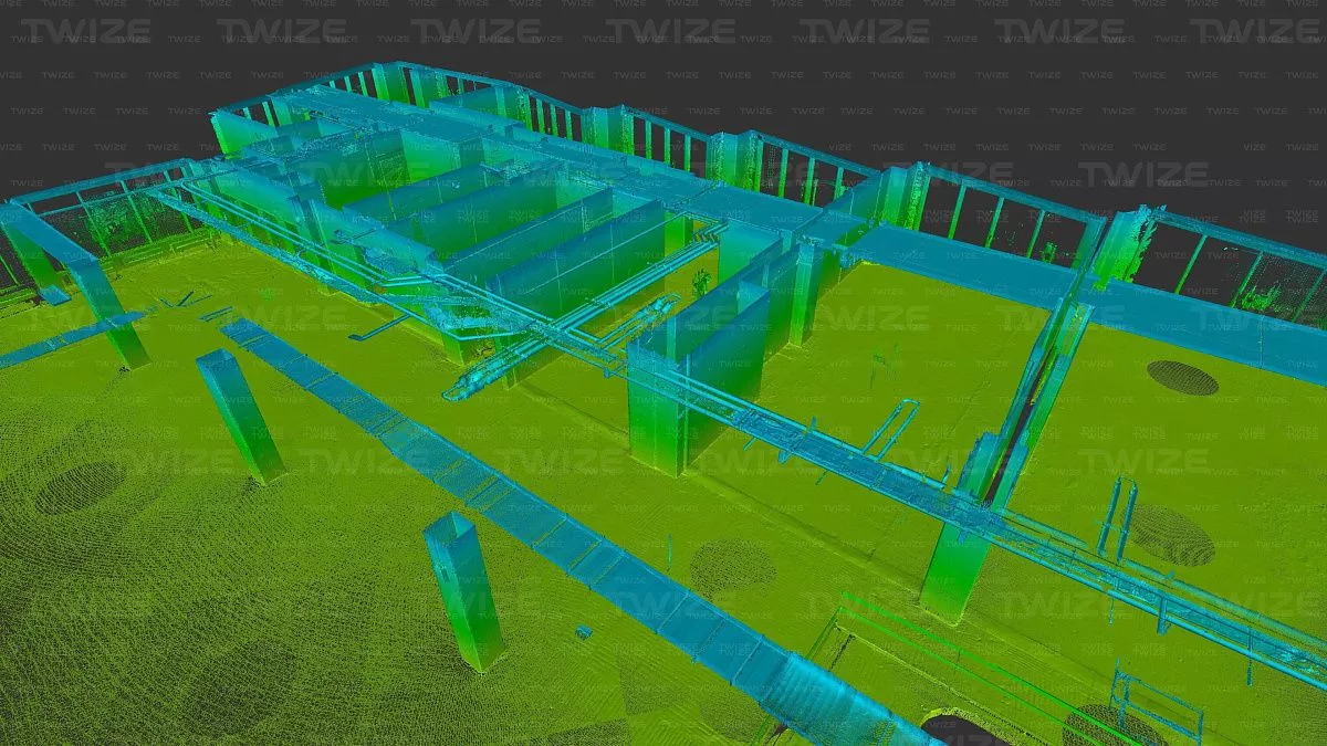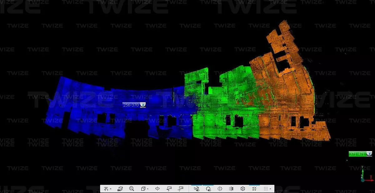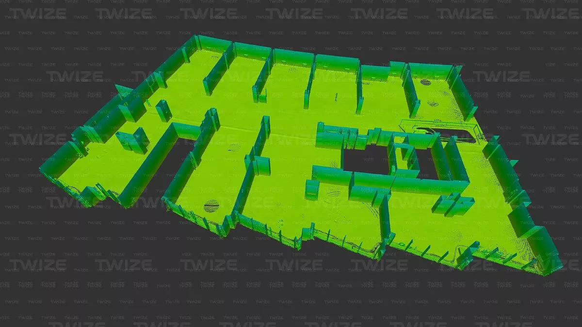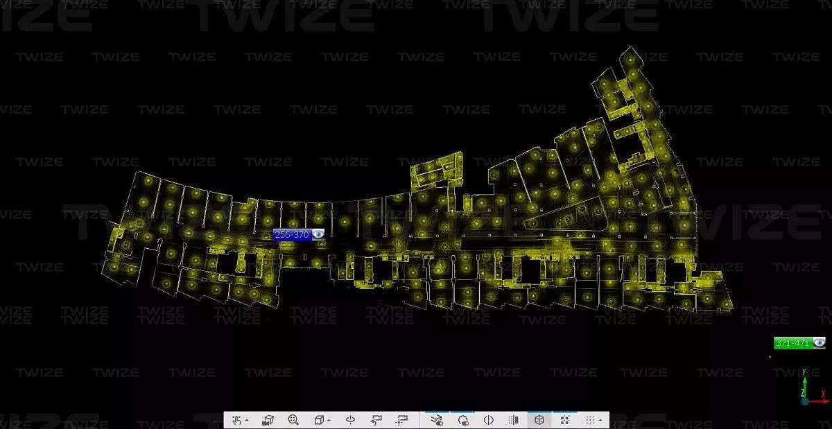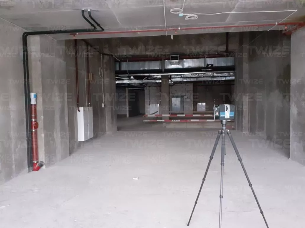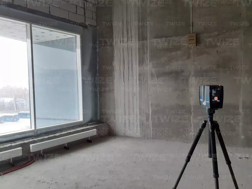 Проведено 3D‑сканирование этажа жилого комплекса. По результатам сканирования сформировано облако точек помещений этажа здания со всеми инженерными коммуникациями. Создан план этажа с высотными отметками и инженерными коммуникациями.