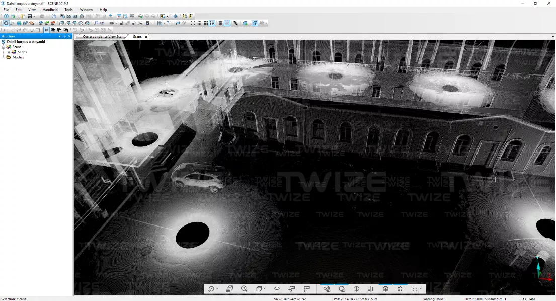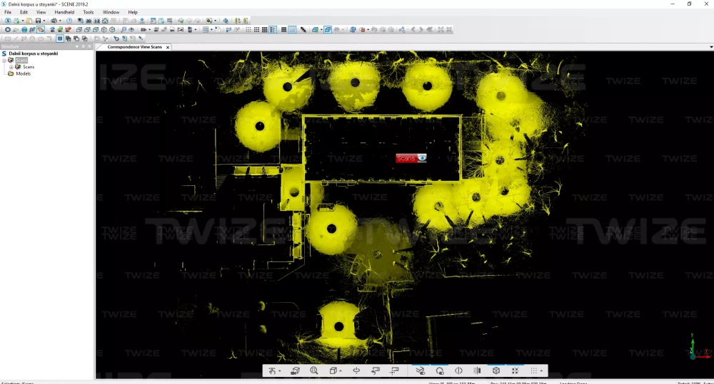облако точек фасада здания с установками сканера размещенными в единой системе координат