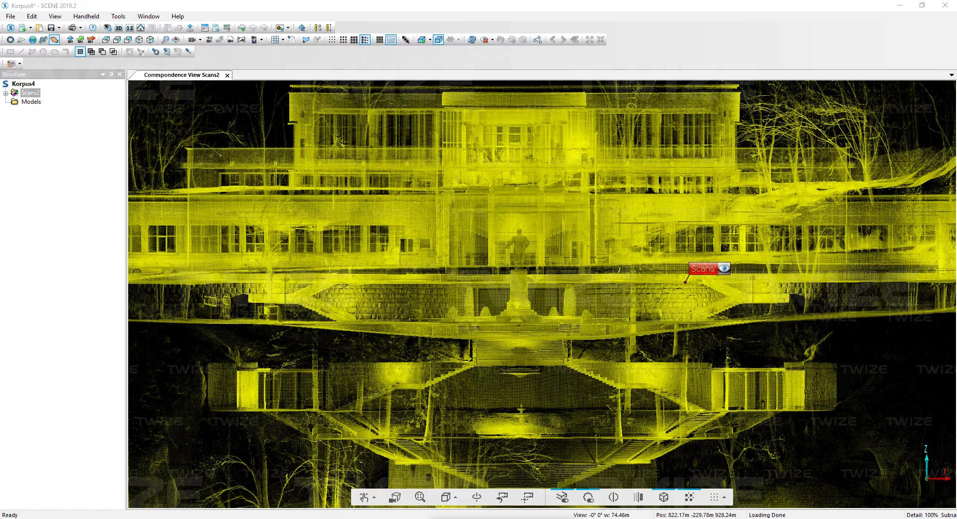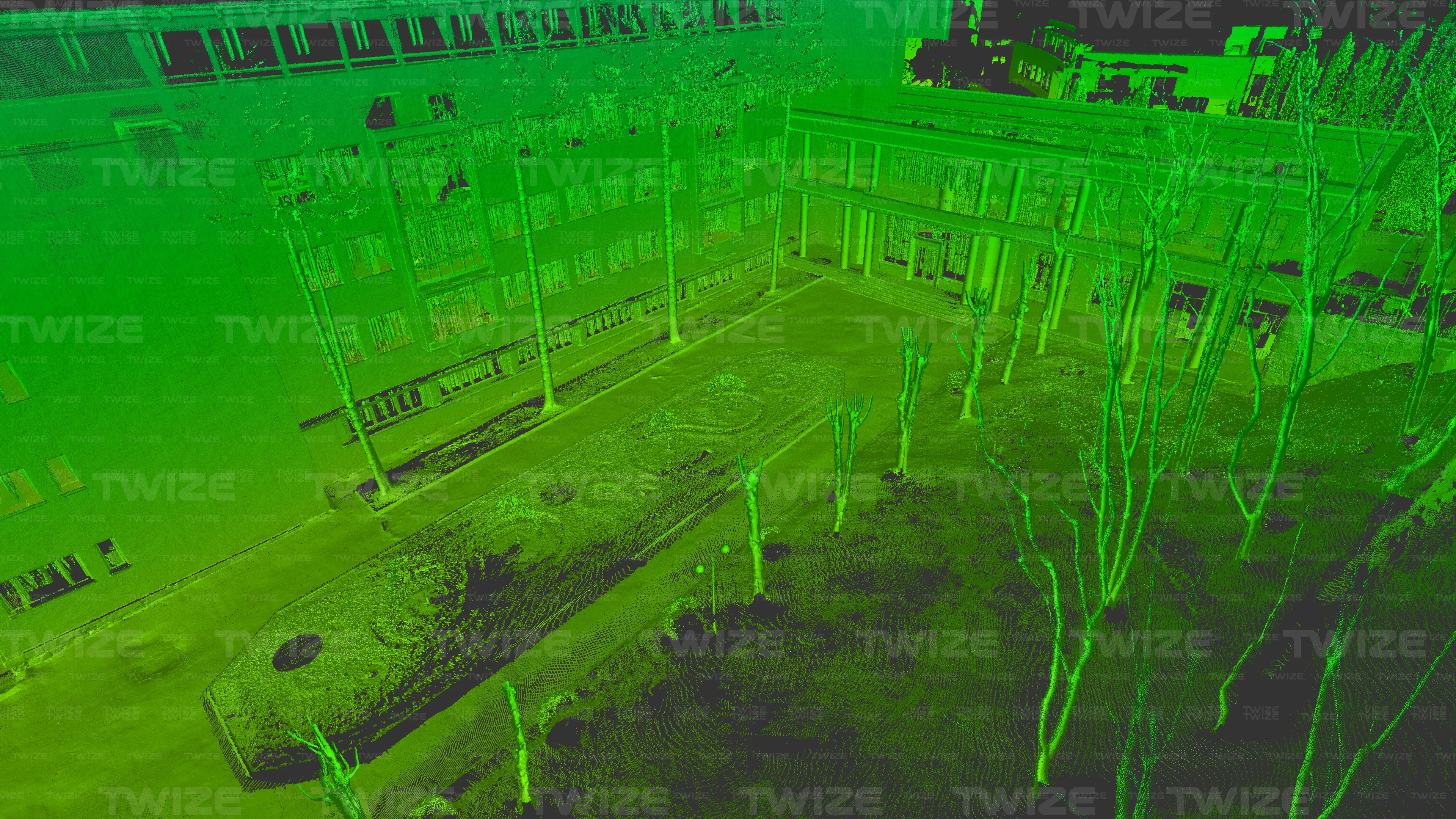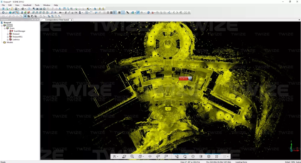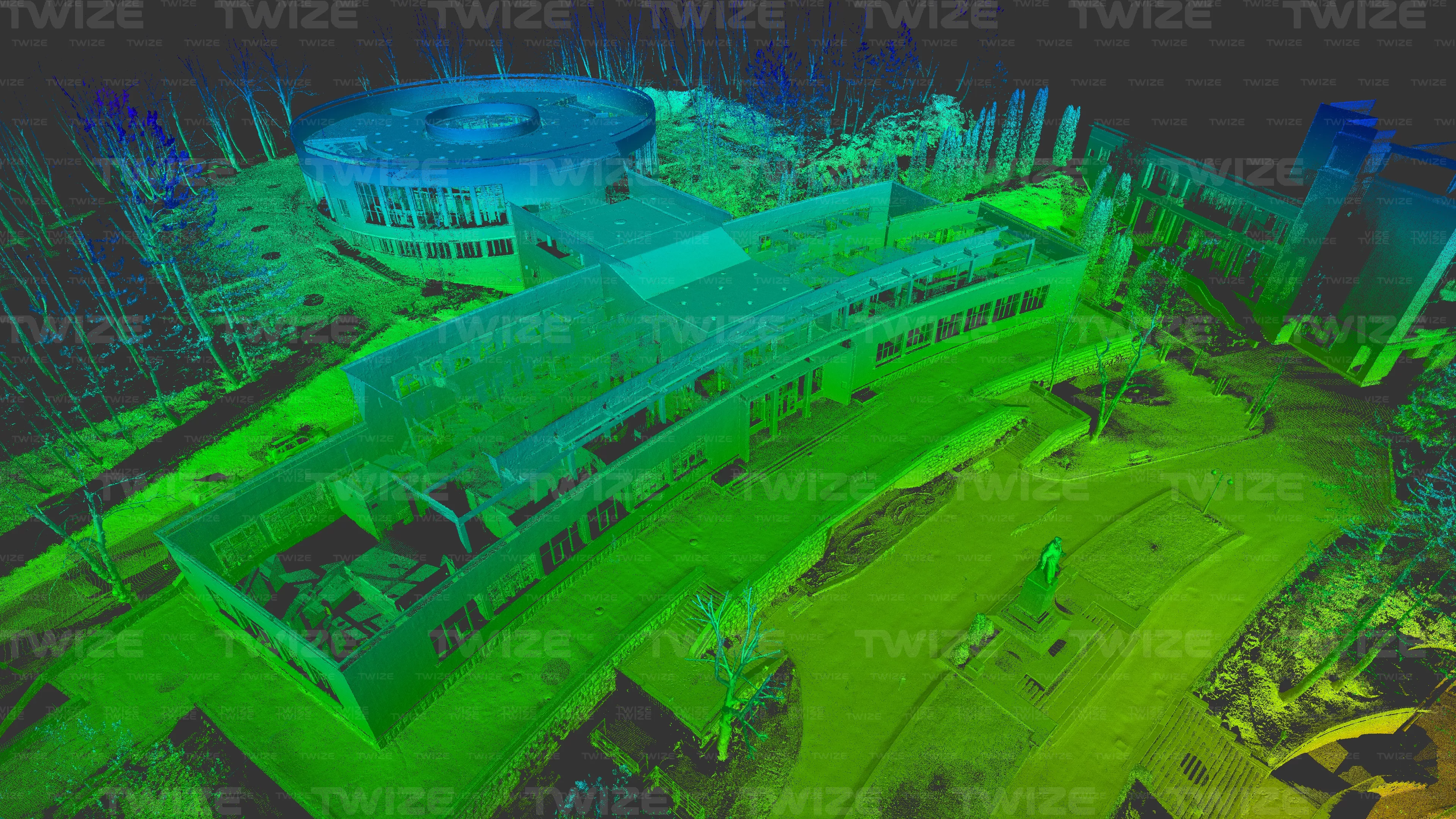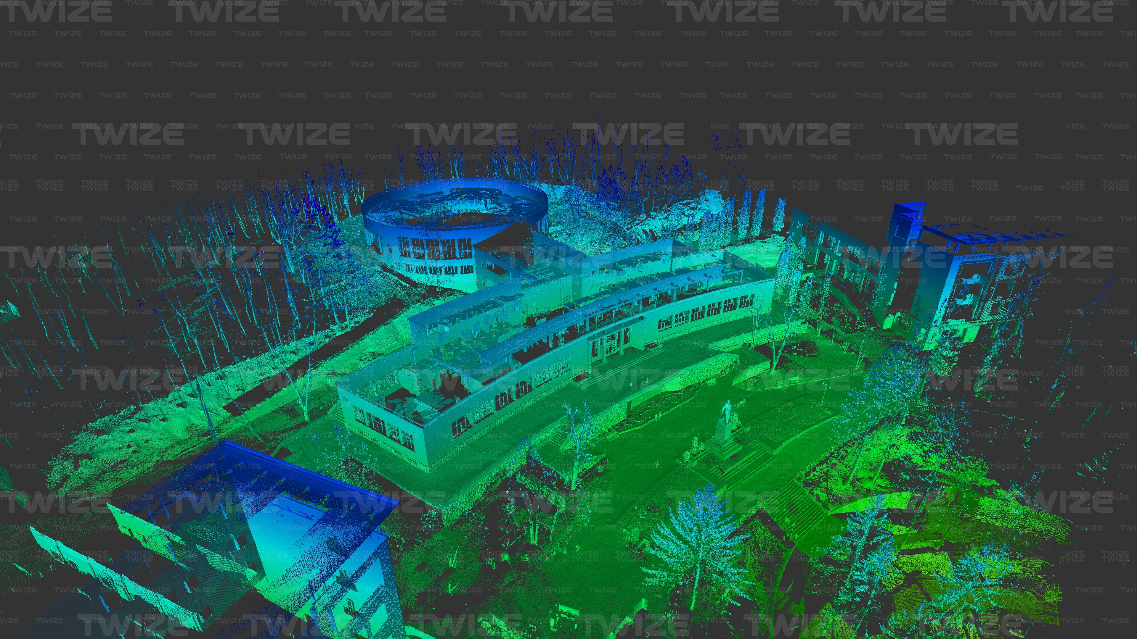 Проведено 3D‑сканирование корпусов и лестницы. По результатам сканирования сформировано облако точек комплекса.