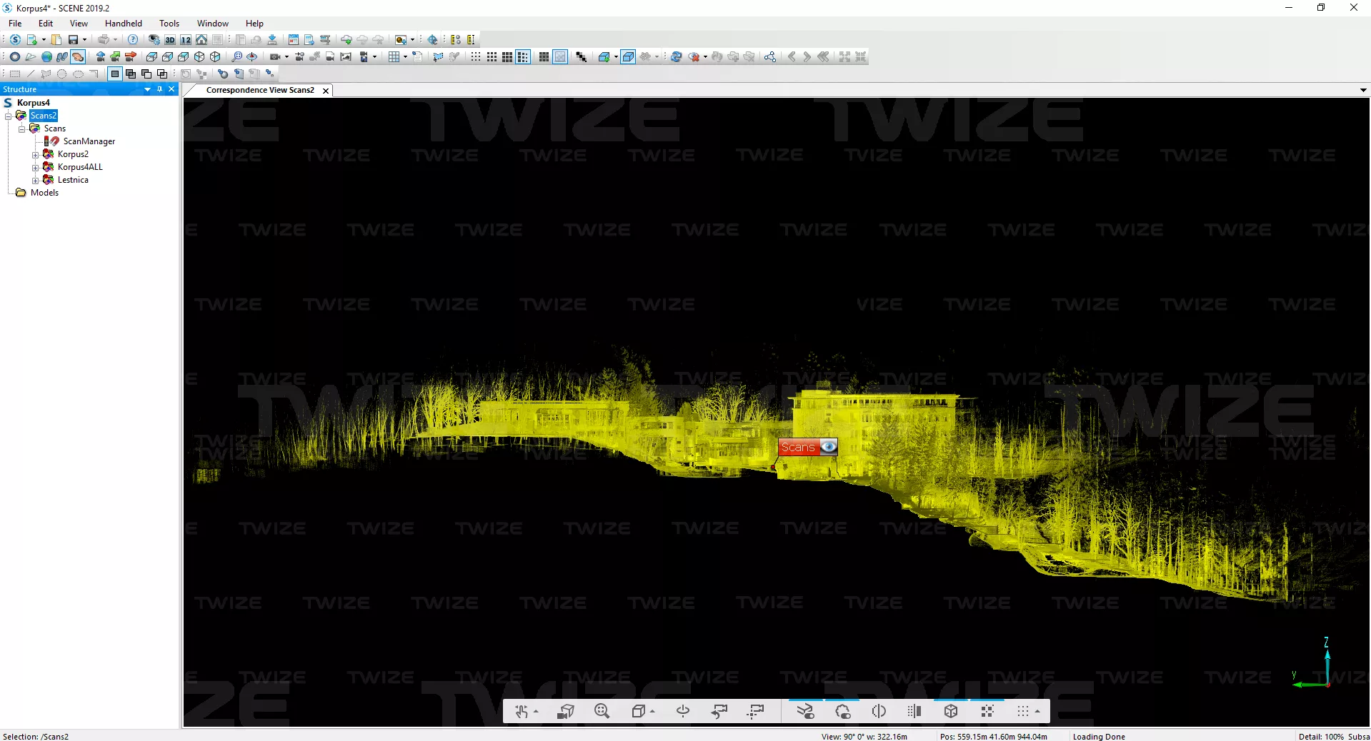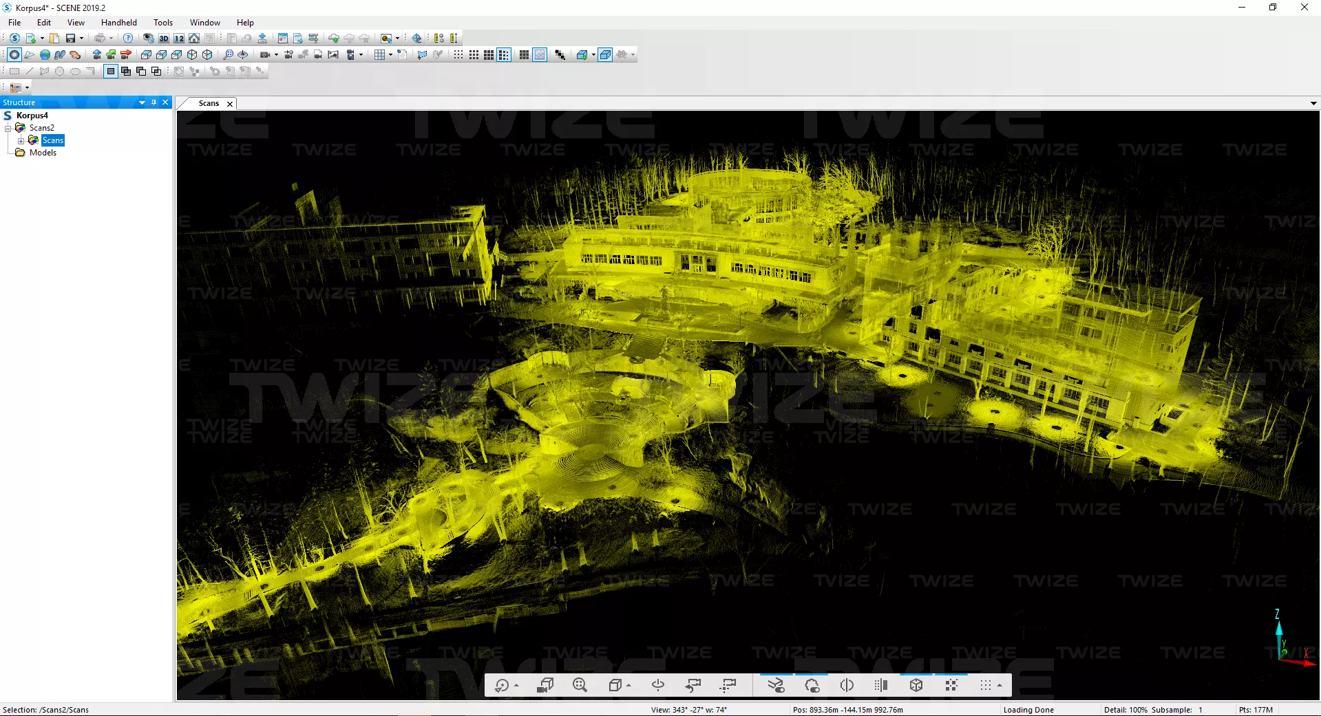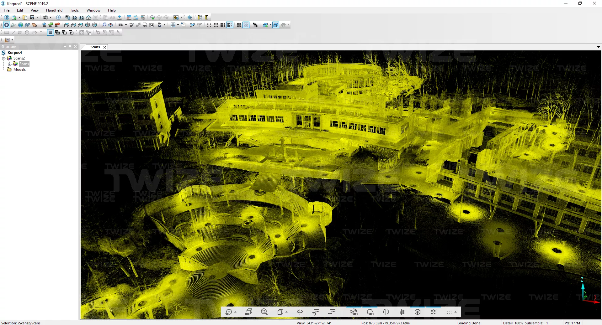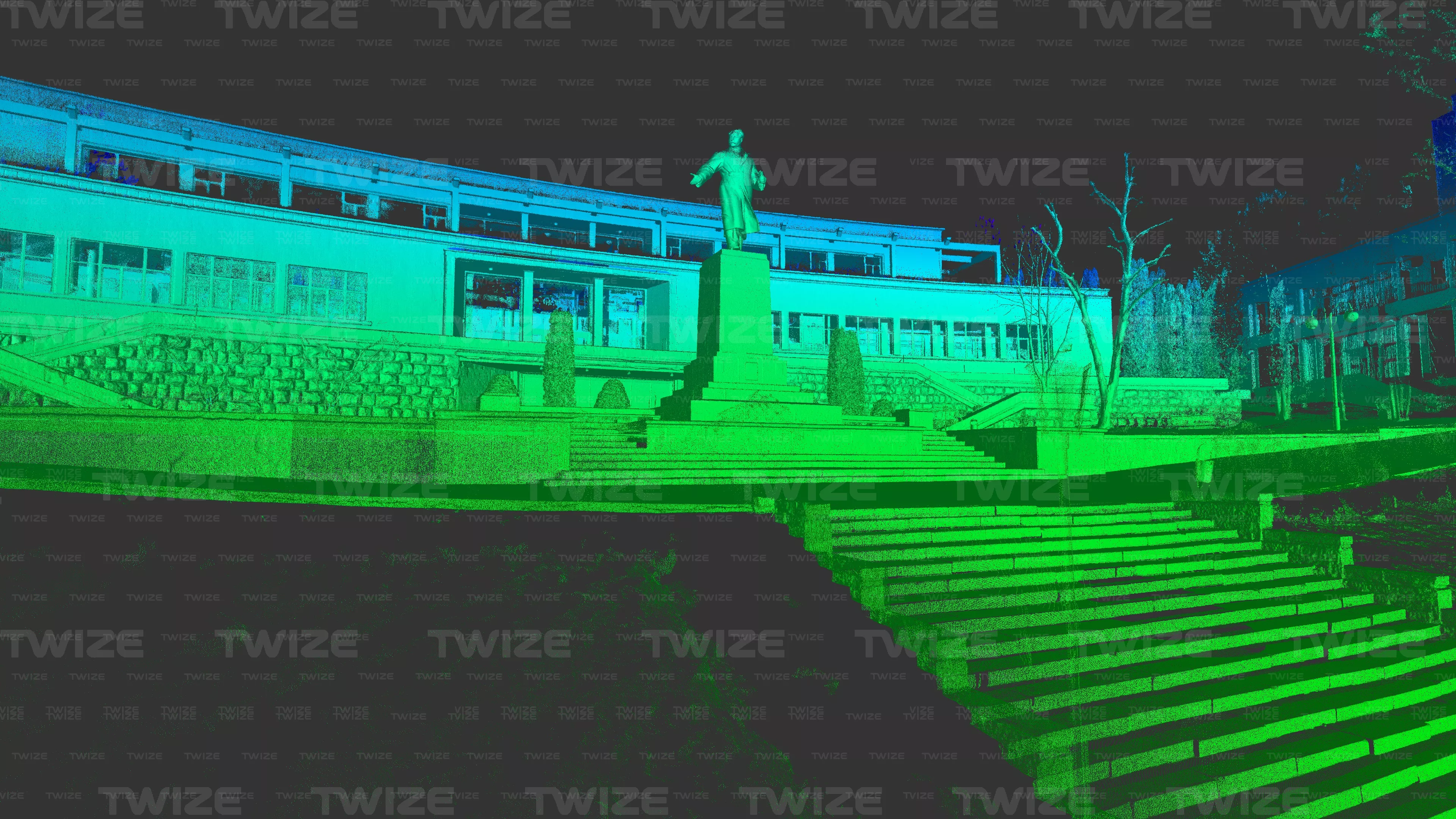 Проведено 3D‑сканирование корпусов и лестницы. По результатам сканирования сформировано облако точек комплекса.
