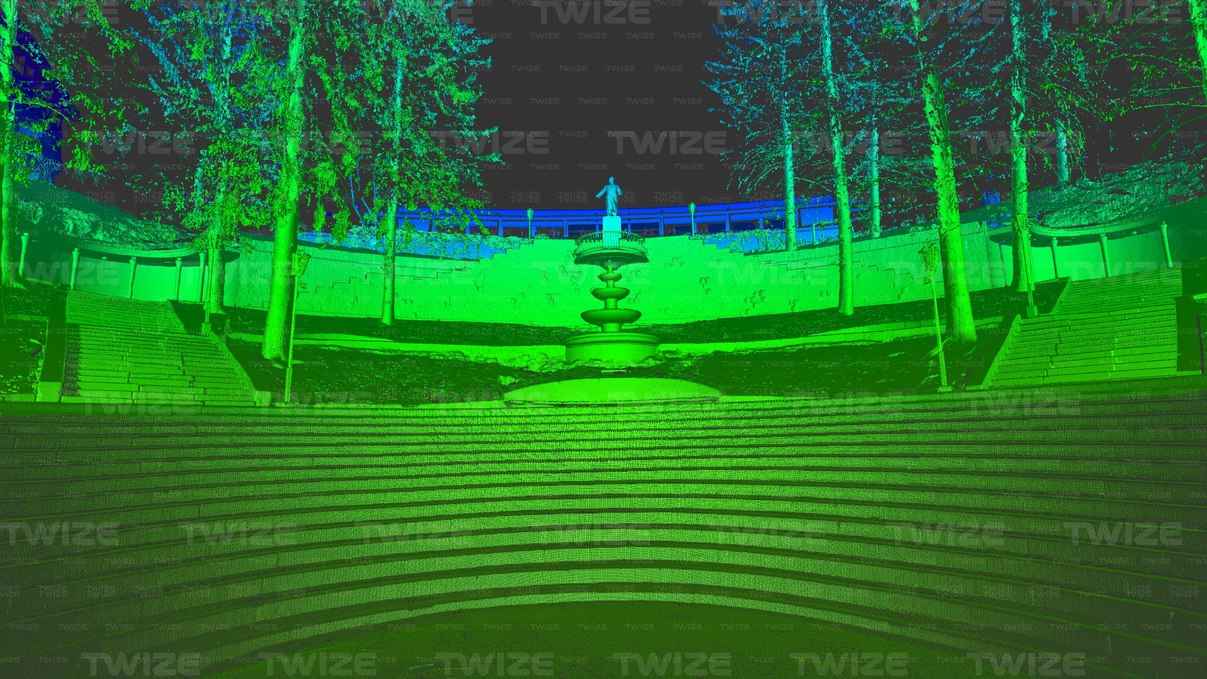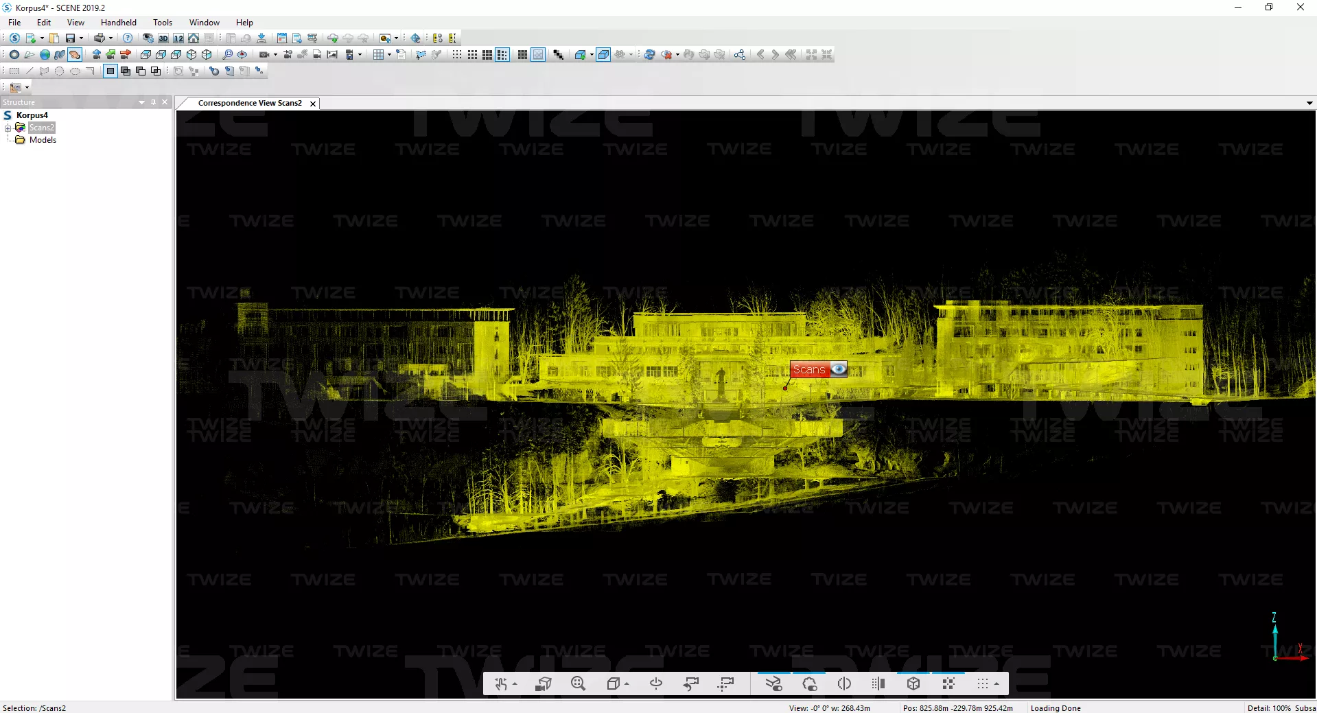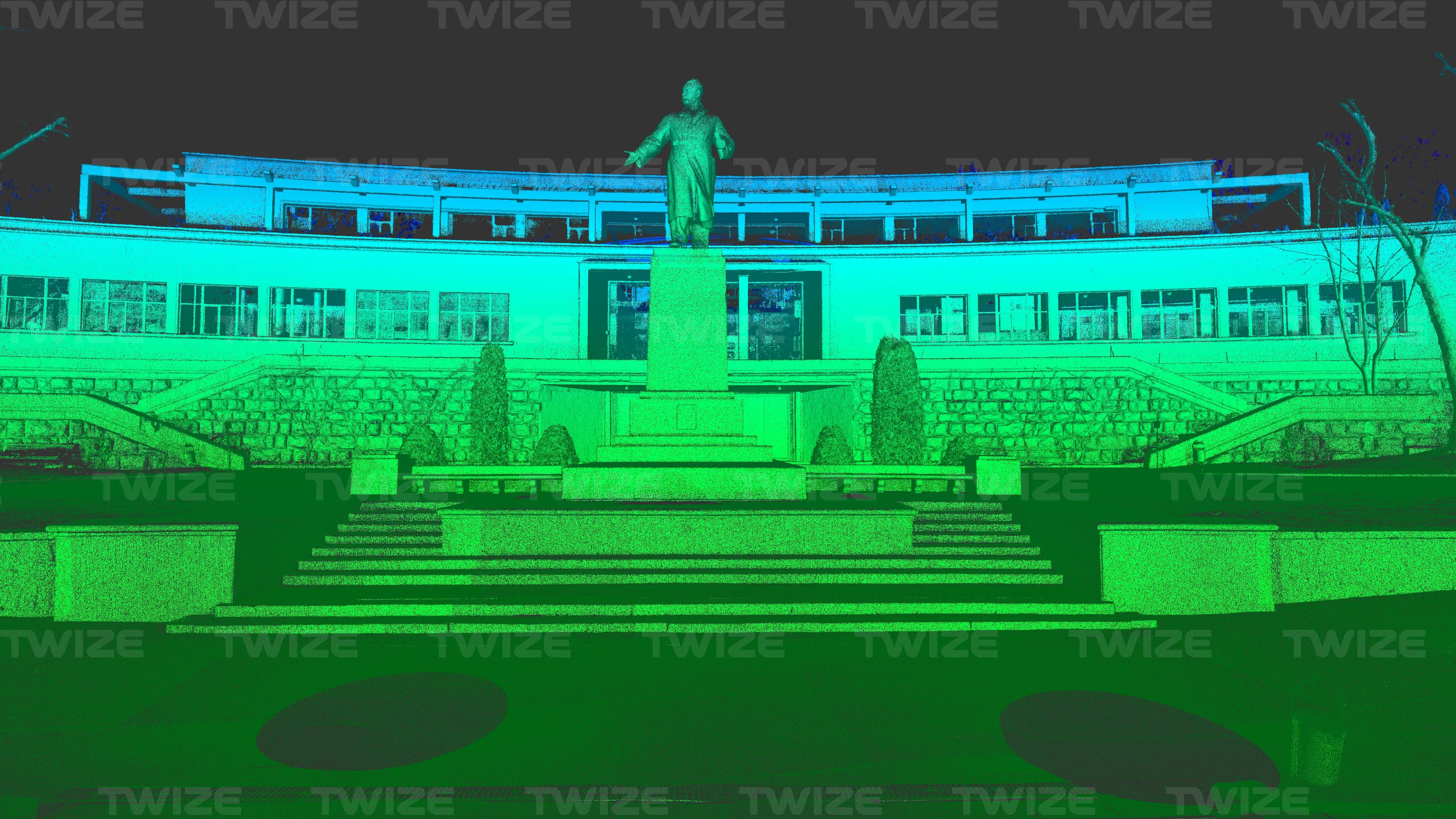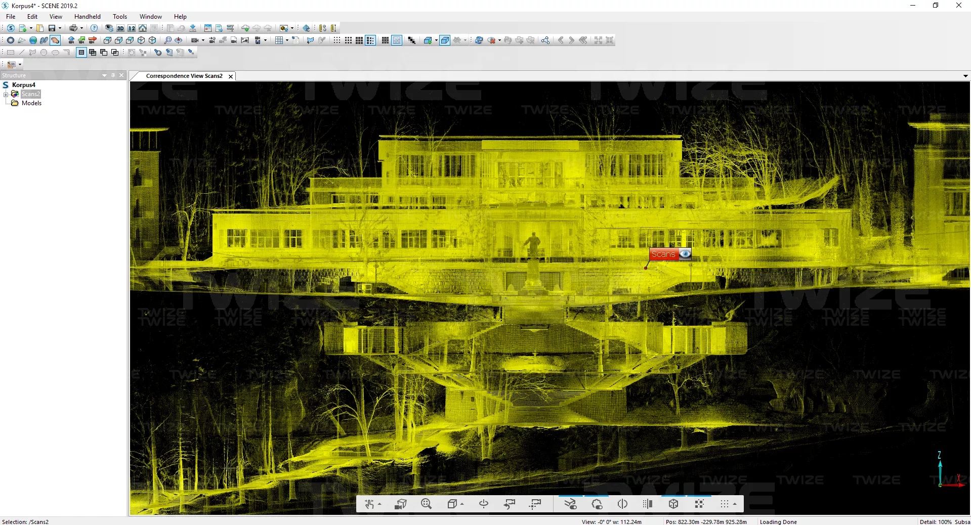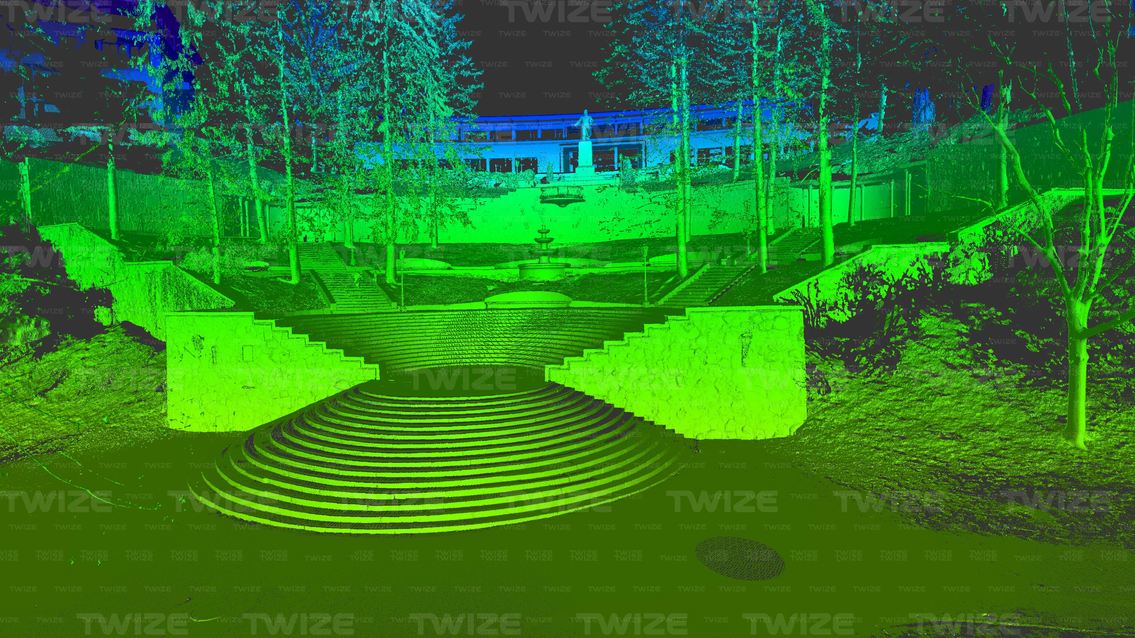 Проведено 3D‑сканирование корпусов и лестницы. По результатам сканирования сформировано облако точек комплекса.