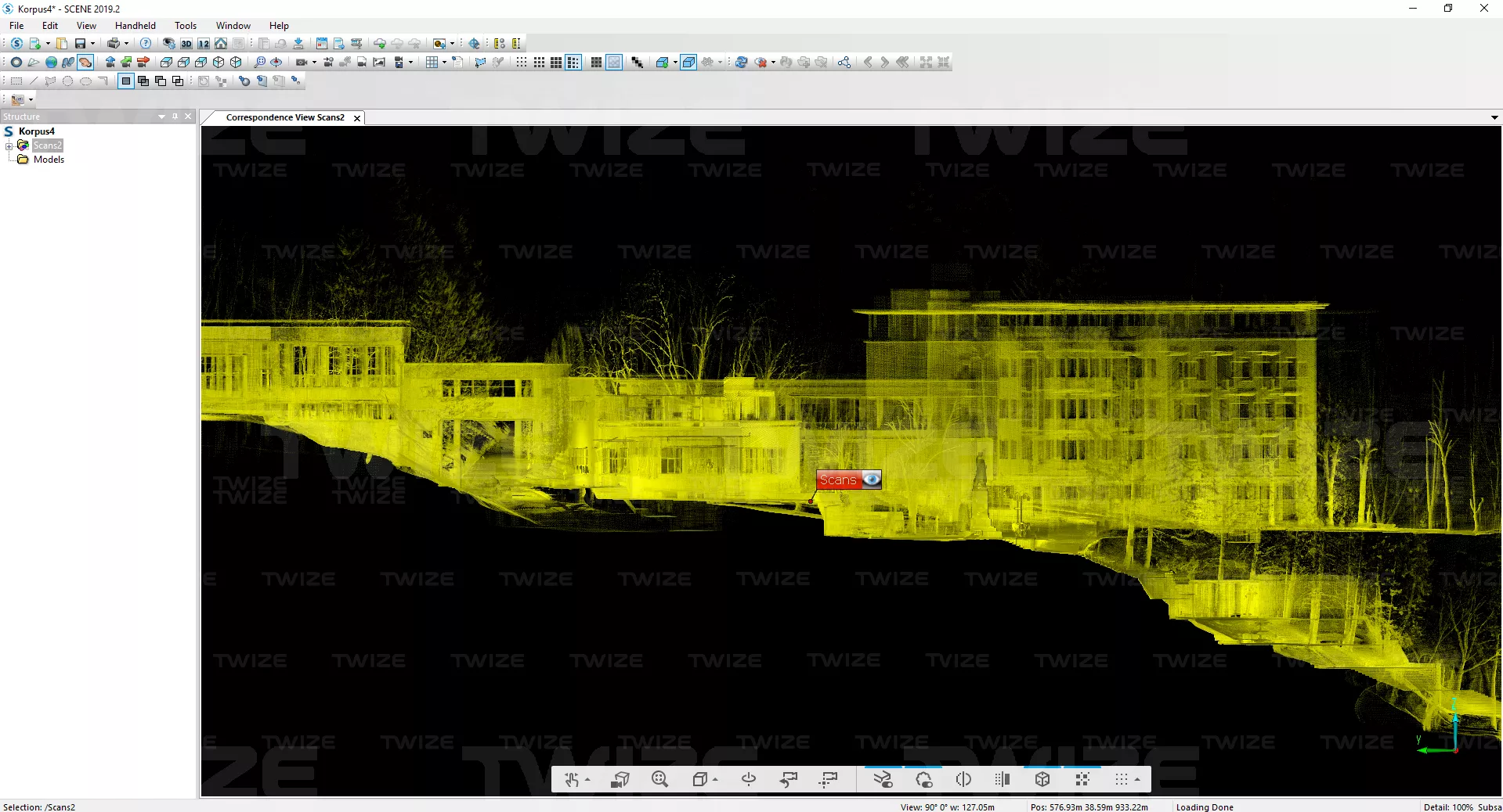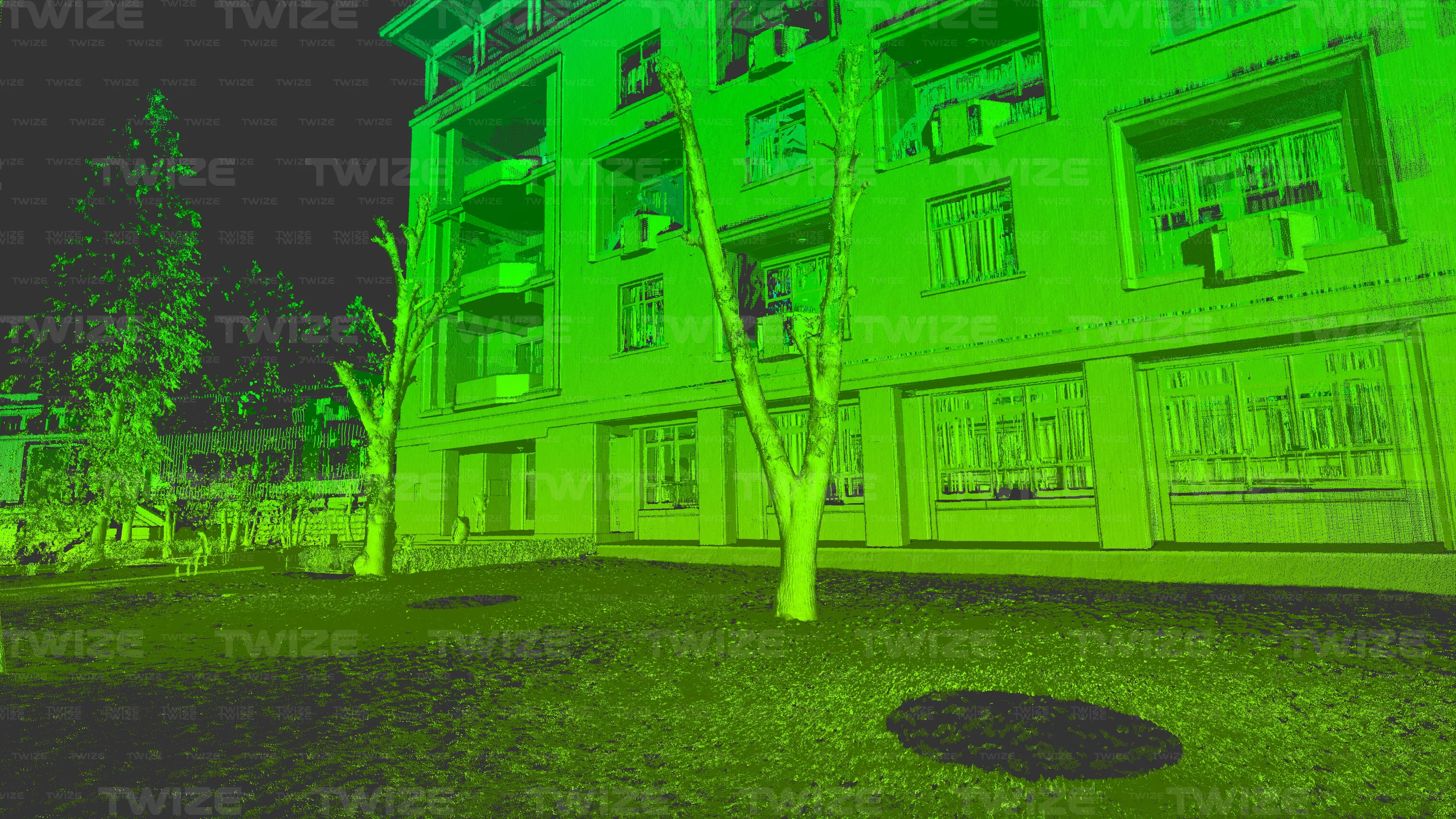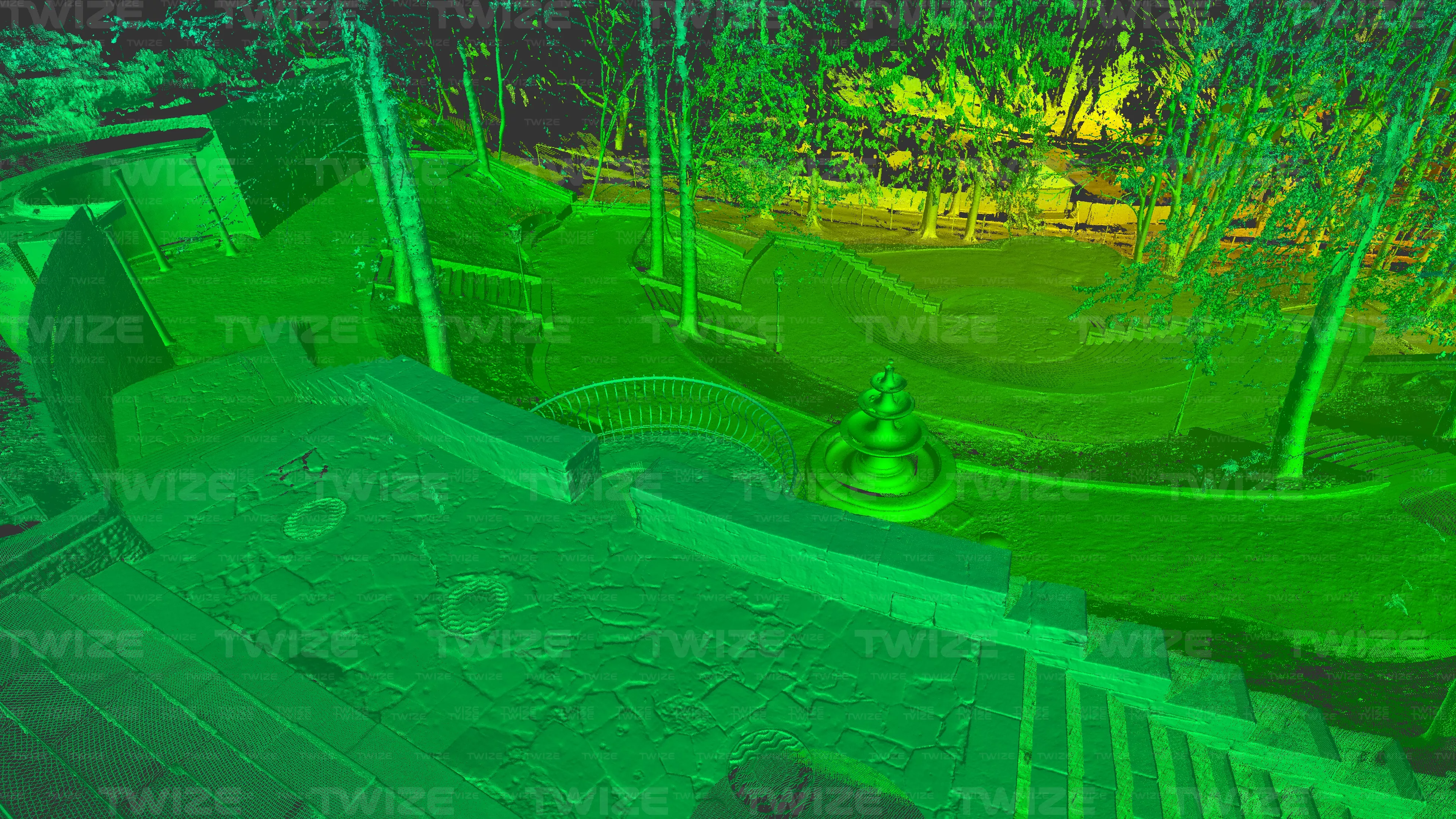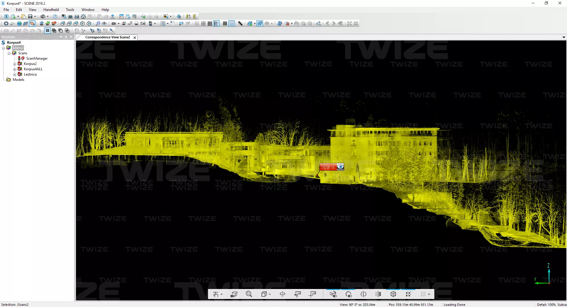 Проведено 3D‑сканирование корпусов и лестницы. По результатам сканирования сформировано облако точек комплекса.