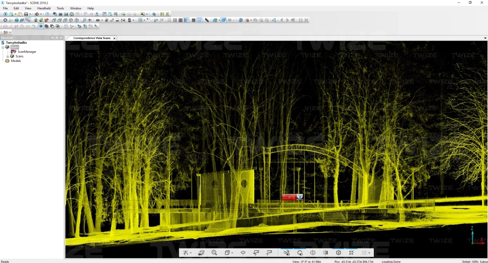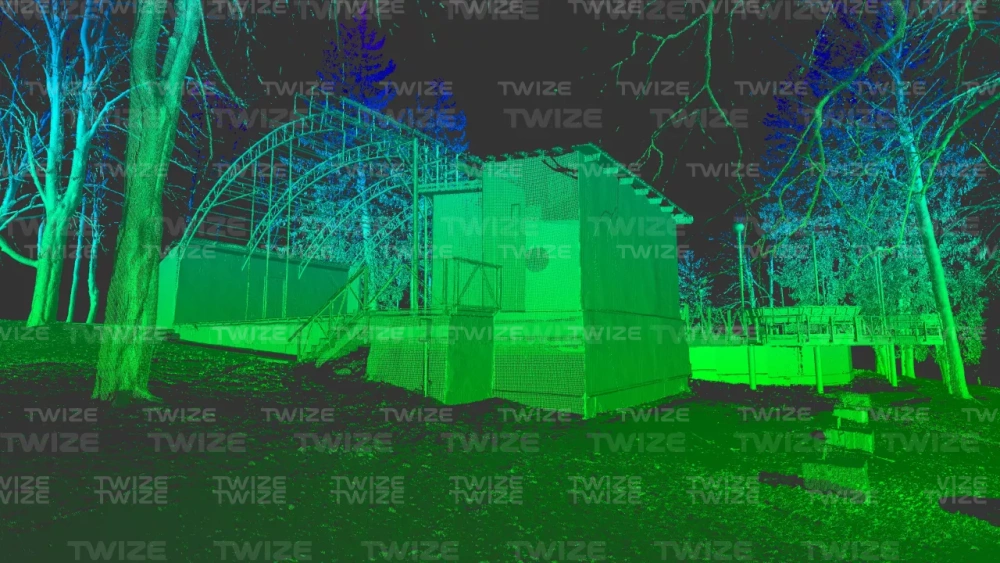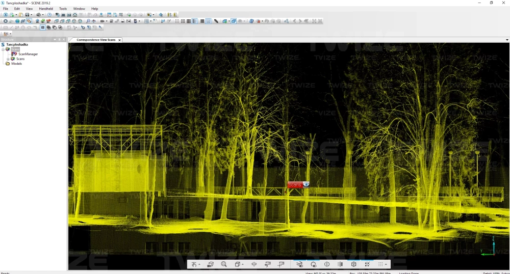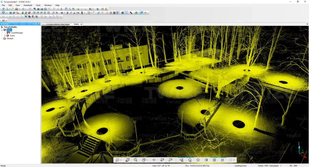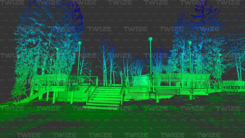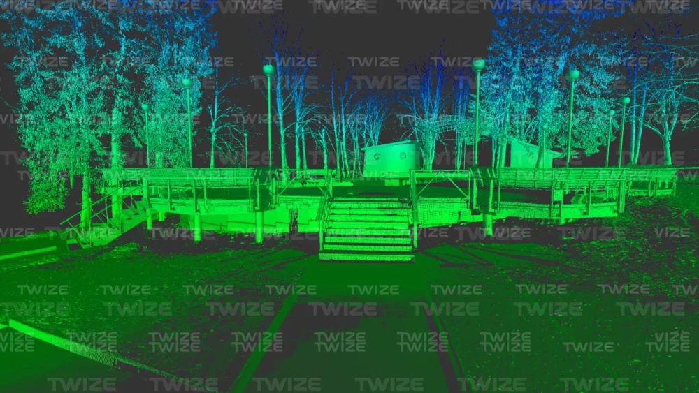 Проведено 3D‑сканирование паркового танцпола. По результатам сканирования сформировано облако точек танцпола.