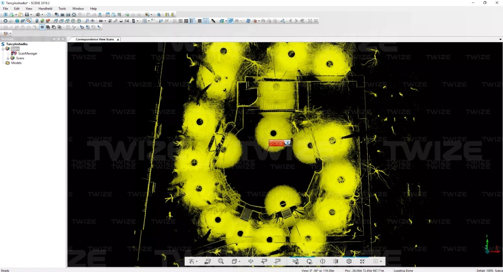облако точек танцпола с установками сканера, размещенными в единой системе координат