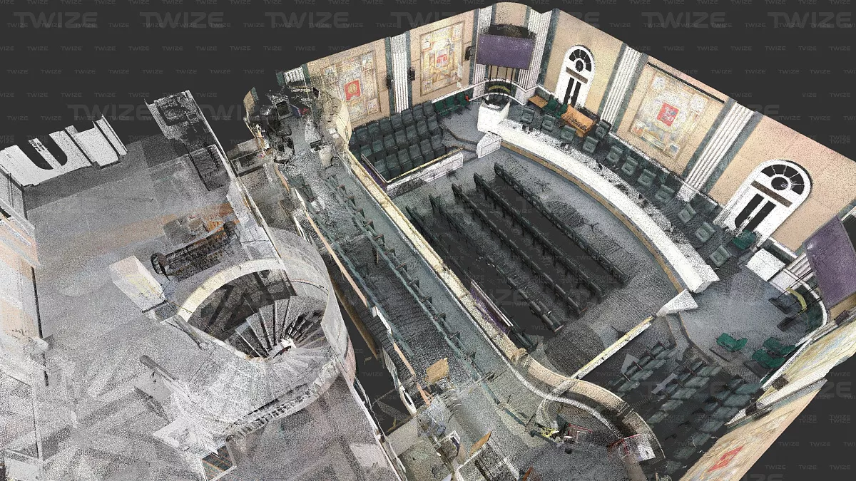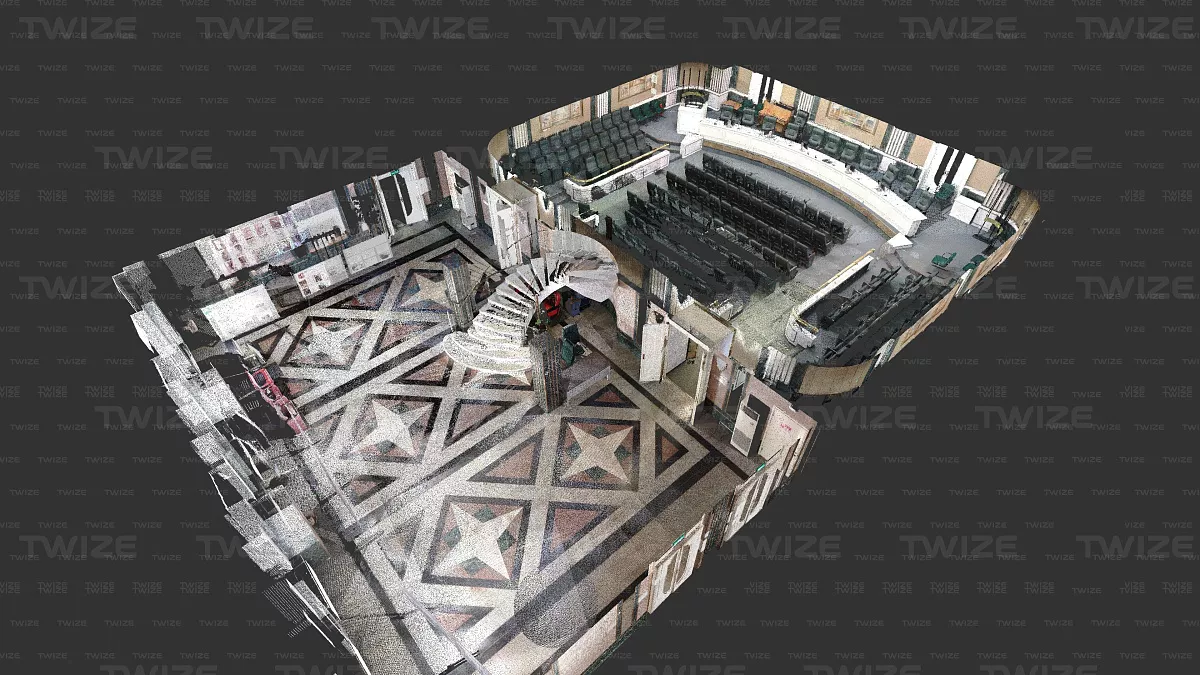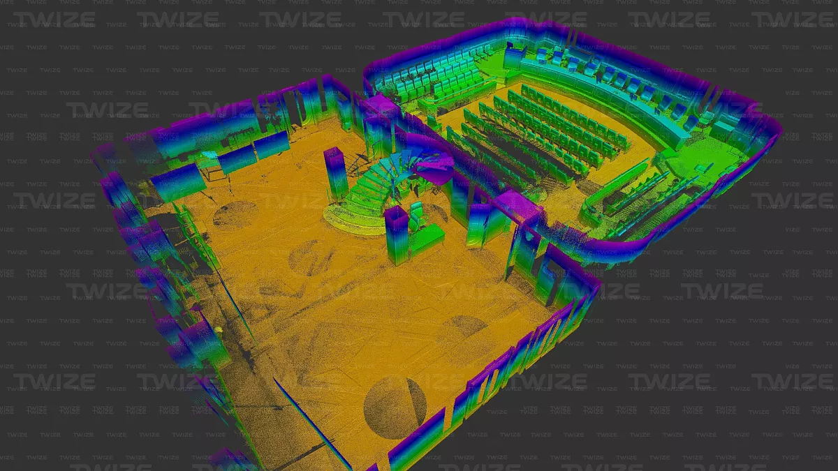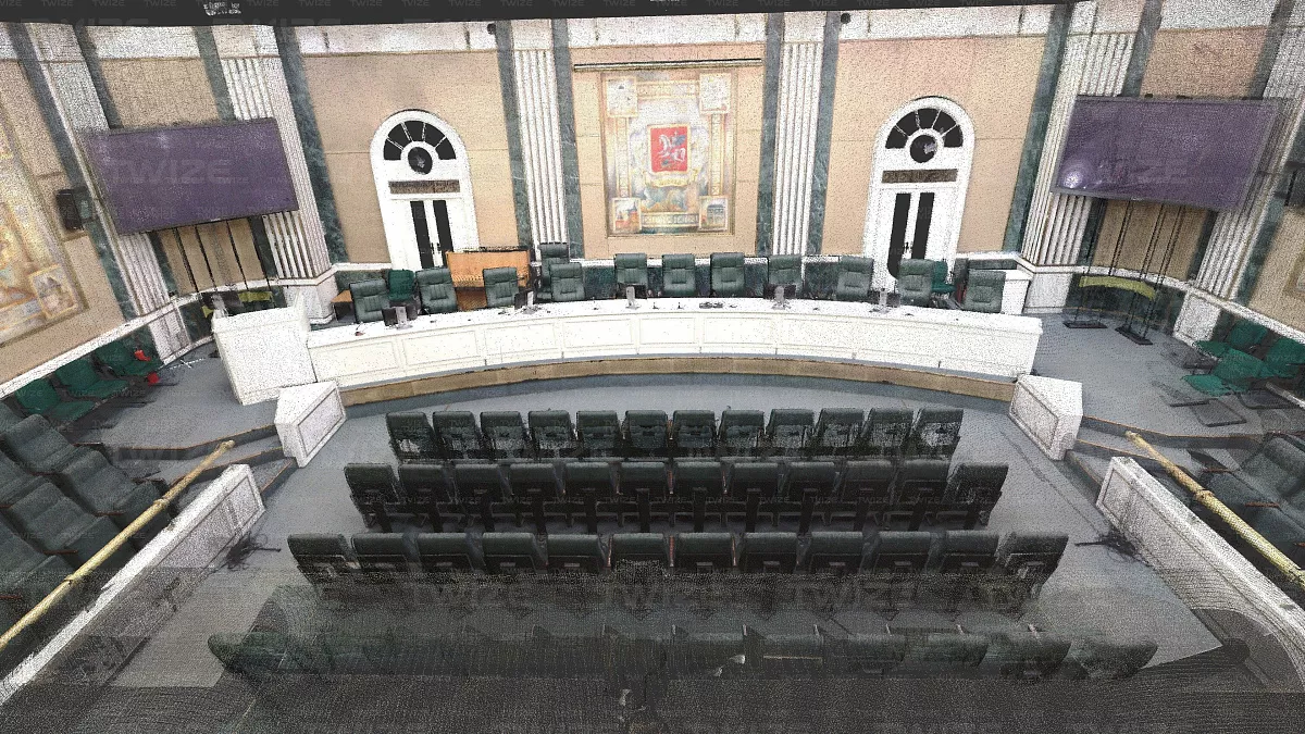 Проведено 3D‑сканирование конференц‑зала и прилегающих помещений (зал, холл первого и второго этажа). По результатам сканирования сформированы поэтажные сечения облака точек.