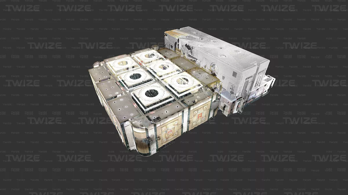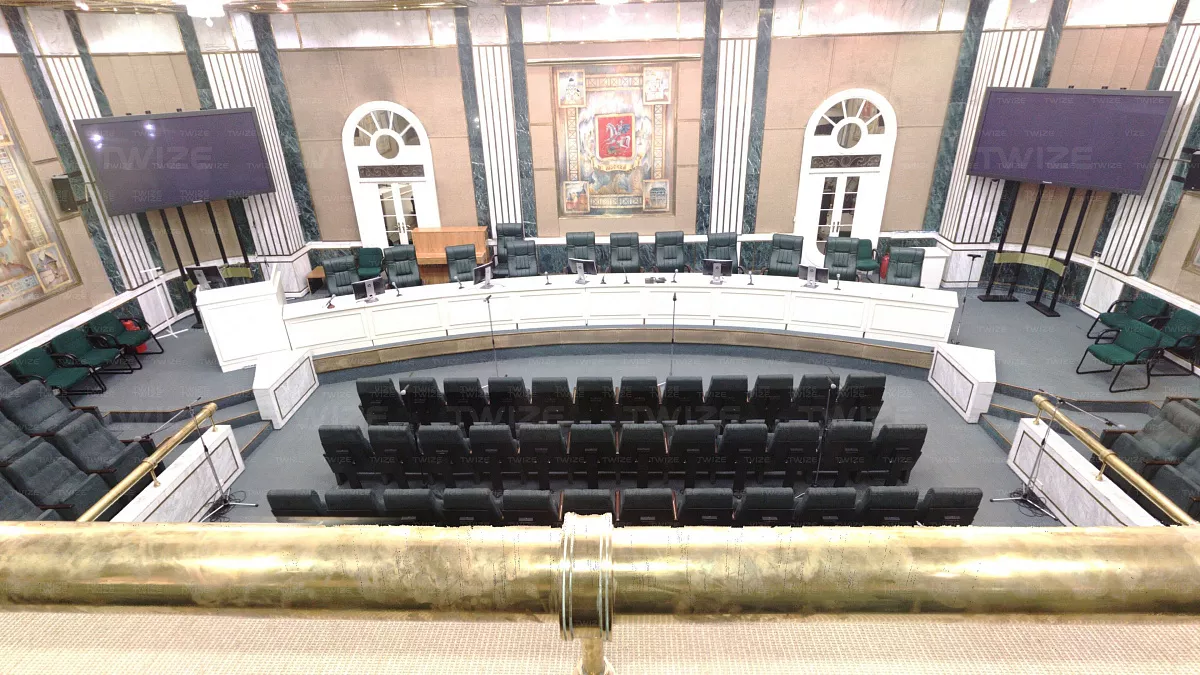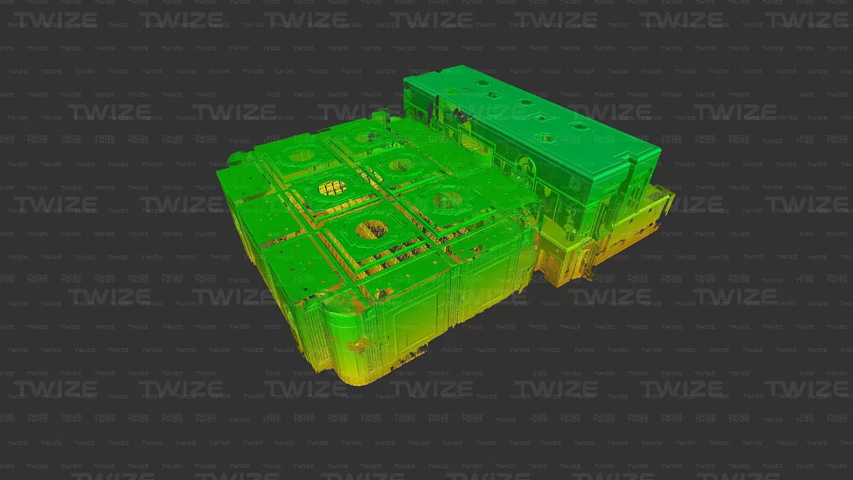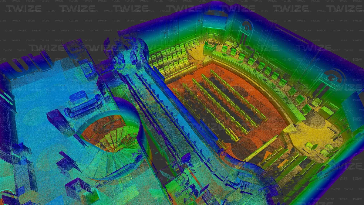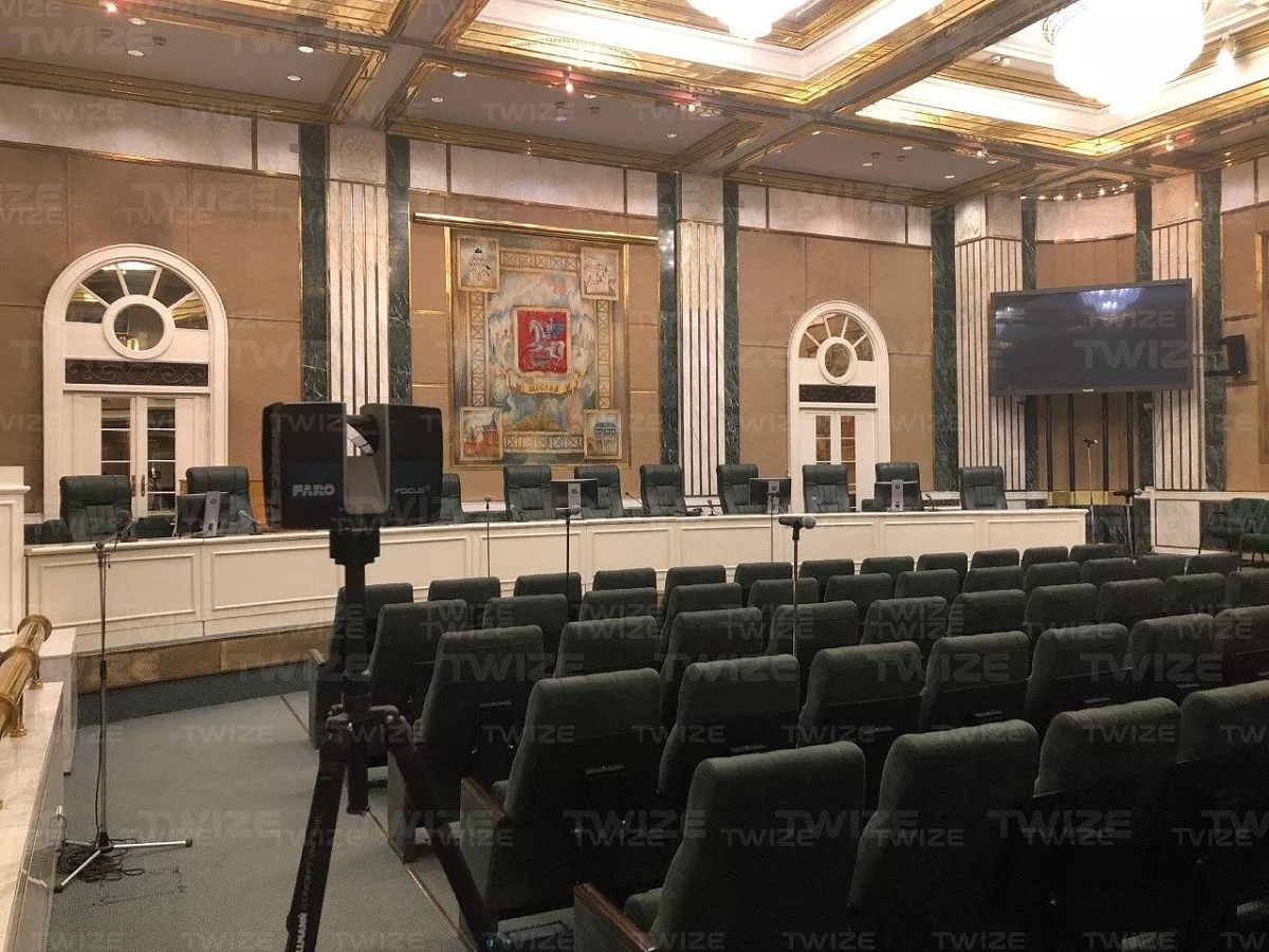 Проведено 3D‑сканирование конференц‑зала и прилегающих помещений (зал, холл первого и второго этажа). По результатам сканирования сформированы поэтажные сечения облака точек.