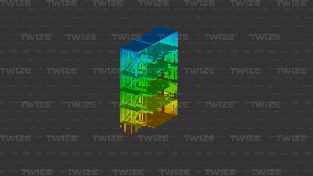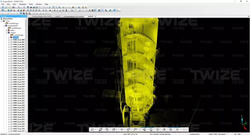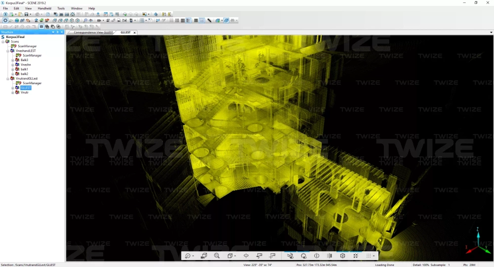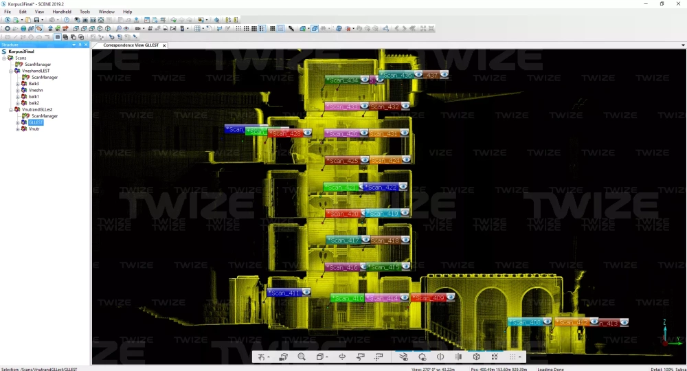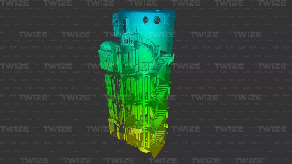 Проведено 3D‑сканирование главной и винтовой лестницы доходного дома. По результатам сканирования сформировано облако точек винтовой и главной лестниц здания.