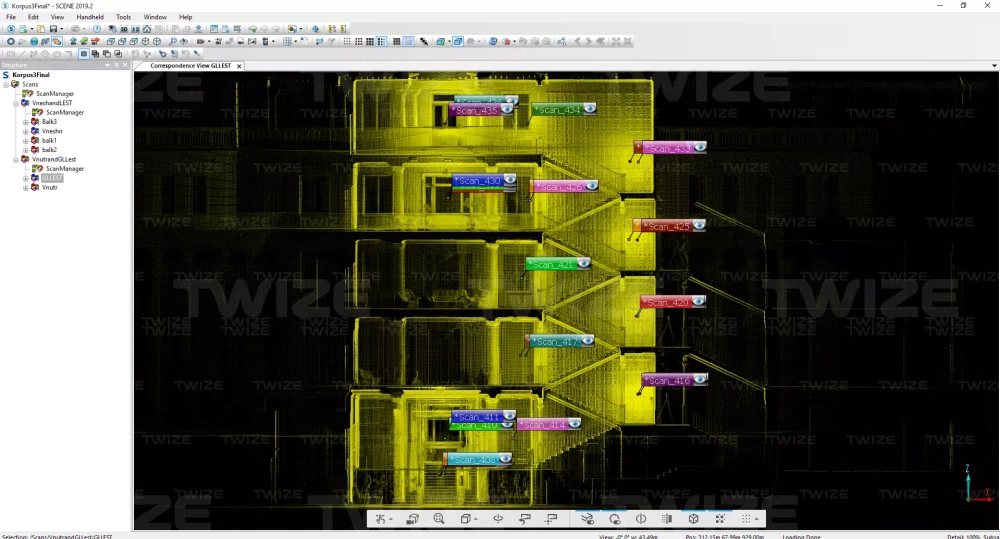 облако точек лестниц с установками 3D‑сканера размещенными в единой системе координат